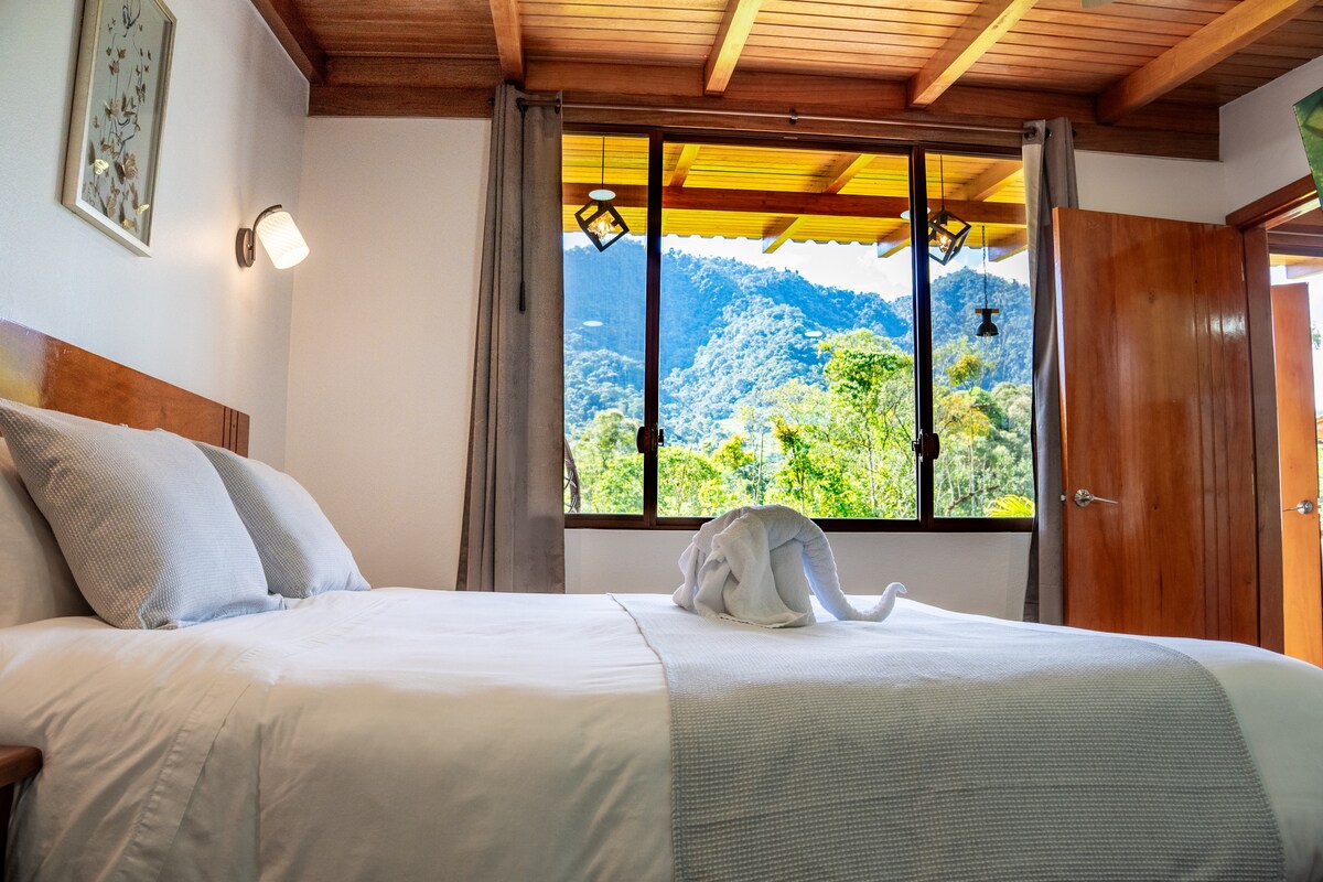 Quédate en un lugar elegante en Mindo, cerca de todo lo que quieras visitar. Cuentas con desayuno incluido. Disfruta del fácil acceso a tiendas y restaurantes de Mindo desde esta encantadora y moderna Suite. Está equipada con cama King, tina hidromasaje, balcón privado, sala de estar con sofacama, cocina totalmente equipada, piscina, muebles de exterior, parqueadero privado, camas colgantes frente al río, sala de masajes con costo extra.
