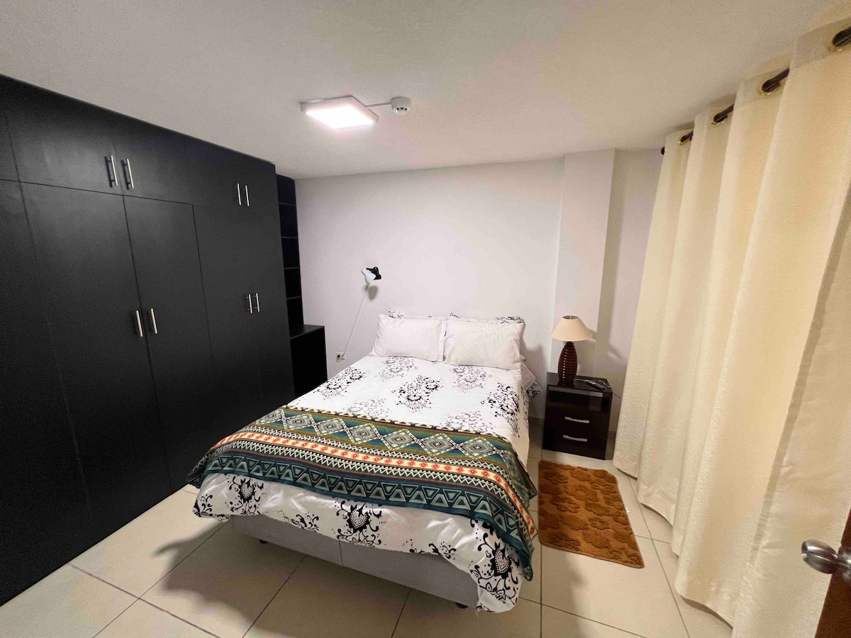 Disfruta de nuestro elegante y moderno estudio ubicado cerca de centros comerciales, restaurantes, supermercados, cines, parques y avenidas principales. El estudio cuenta con: Cama Queen 2.5 plaza Cocina equipada Desayunador Smart TV Red wifi La suite NO INCLUYE parqueadero. En caso de requerir el servicio se debe consultar previamente al realizar la reserva para verificar disponibilidad de espacio, ubicado a dos cuadras fuera del edificio, tiene un costo adicional de $12 por noche.