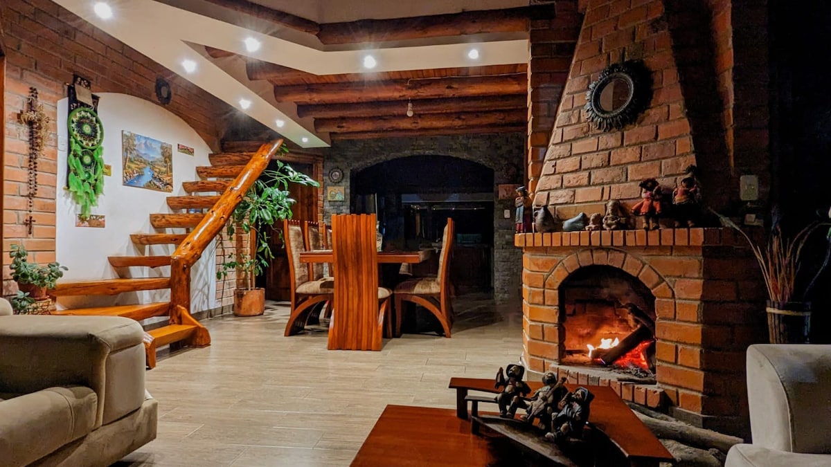 Alojamiento de madera de pino rústico y piedras Naturales con Tres habitaciones más un Altillo con Sofa cama . en cada habitacion disponemos de Una cama matrimonial y dos individuales y Baños Privados total. (7 camas) , una casa completa con cocina bien equipada, comedor, sala de estar con chimenea interior y exterior y con un mirador panorámico hacia el Volcan Mama Cotacachi. Vía - Cotacachi por la Pana- Comunidad La Calera, Cabaña Puñushiki Kalera Lodge Cotacachi- Imbabura- Ecuador