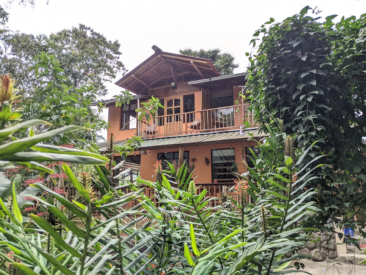 Our Peaceful Paradise by the River is a perfect place in Mindo to enjoy the beauty of nature, only situated a short walk from Mindo Center. The home is close to restaurants, shopping, park & bus station., The house has 2 bedrooms and 2 full baths, and a 1/2 bathroom & full kitchen, Washer/Dryer. The living room has 2 sofas that can open to beds. Enjoy a dip in the river or coffee on the balcony watching the humming birds. There are paintings of nature made by the owner who is an artist.