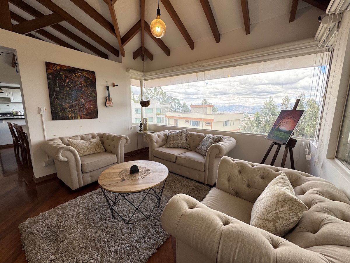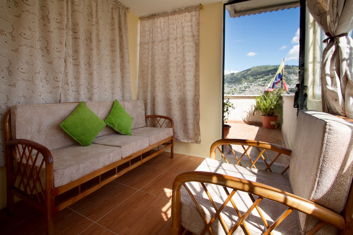 Cozy apartment remodeled in the colonial quarter of Quito, located on the third floor, a loft with a spectacular panoramic view of the Historic Center. It has two bedrooms, two bathrooms, a living room, a dining room, and a kitchen equipped with filtered water and essential implements to meet our guests' needs. The comfortable facilities provide good relaxation. We have Wifi 620Mbps a 1.05Gbps, a telephone line, a television with Netflix, and heaters for the shower and kitchen sinks.