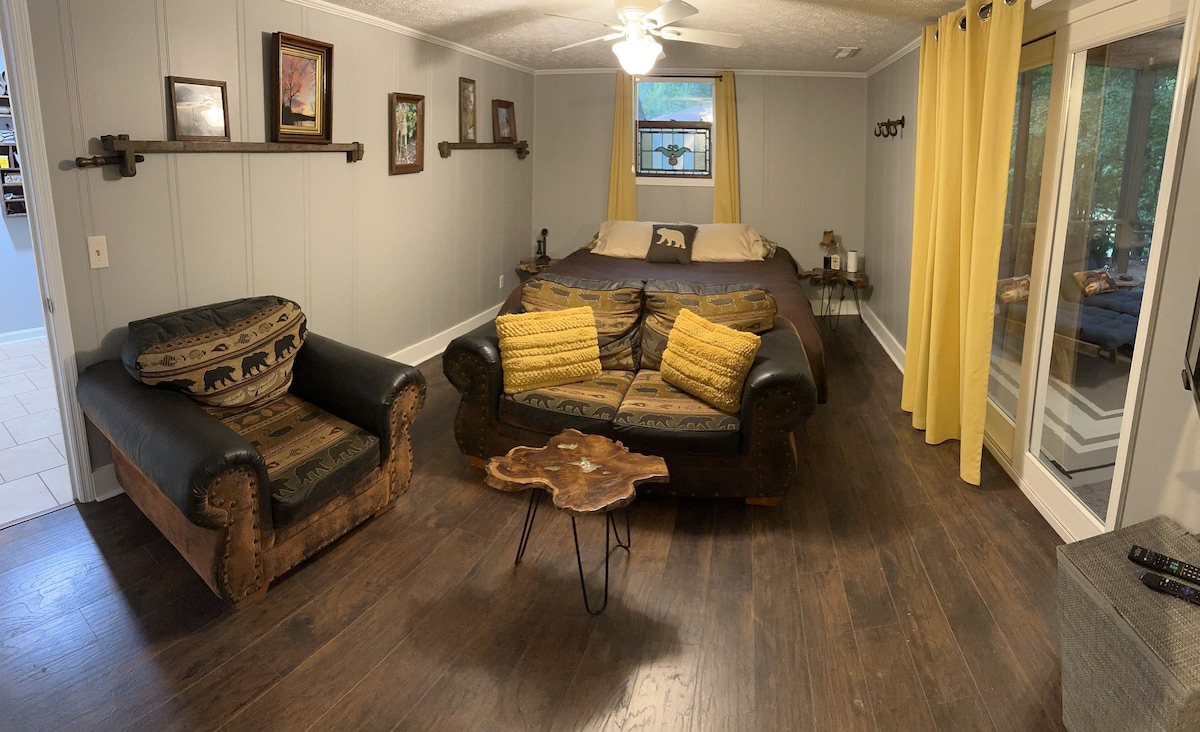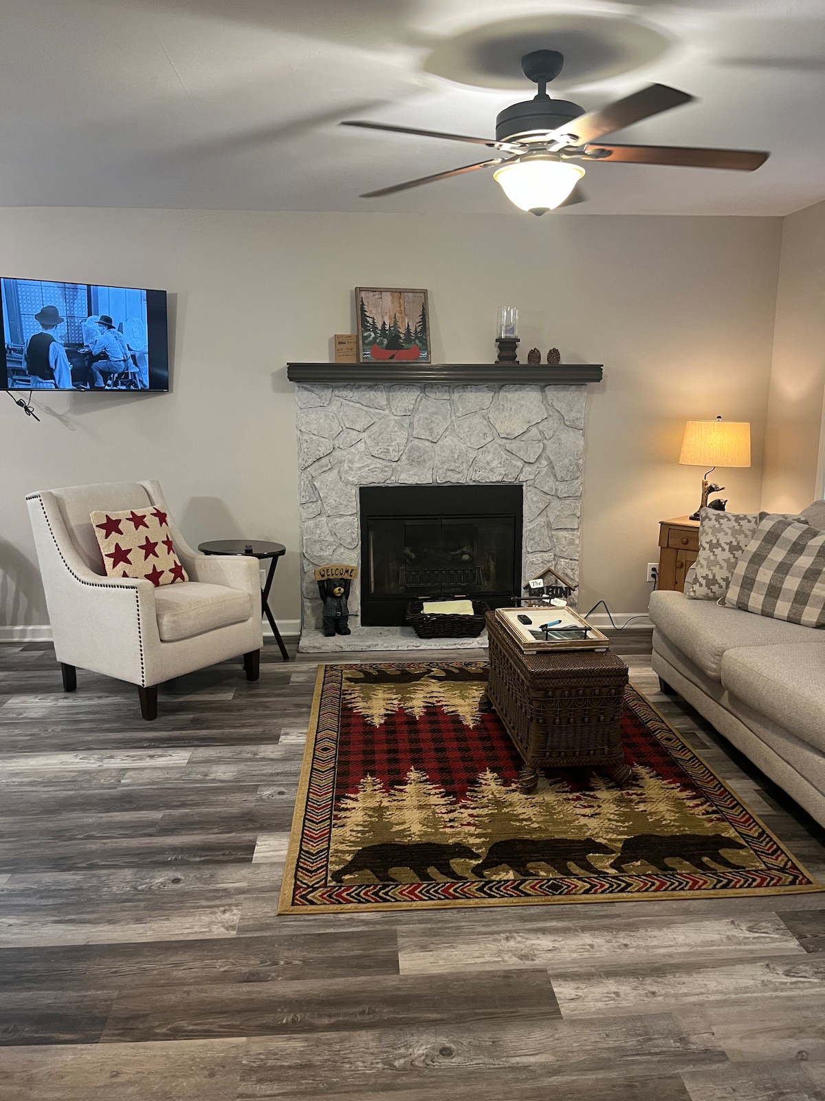 Find comfort and relaxation at this cozy 2 bedroom 2 bath mountain condo. Tucked away in the Appalachian Mountains, Bearfoot Retreat has every creature comfort you could want to make your stay feel like home away from home. Featuring a wood burning fireplace, lake and rockslide view, with an outdoor bar overlooking the woods - this is the retreat you've been looking for, with all the modern amenities; a coffee bar, 70 in smart tv, Smart Home and more.