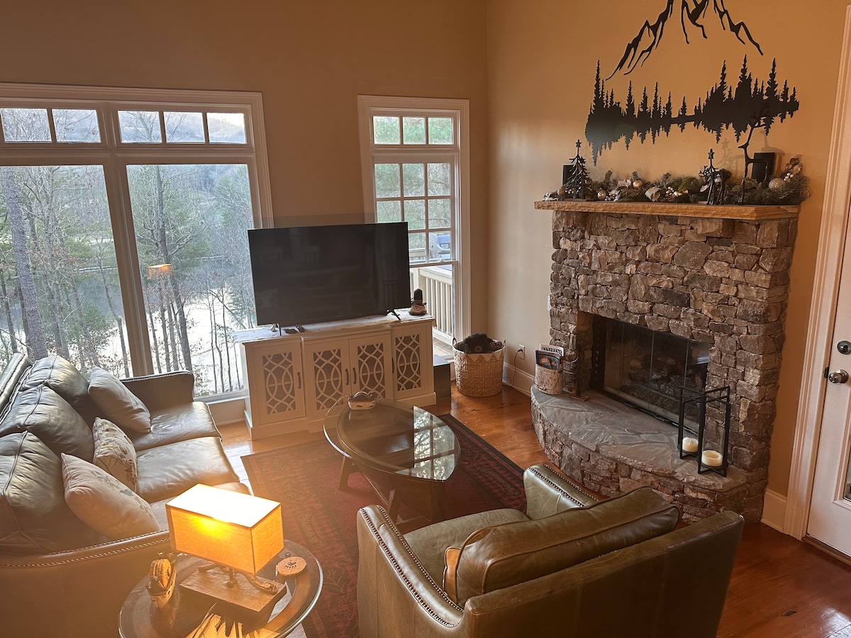 Find comfort and relaxation at this cozy 2 bedroom 2 bath mountain condo. Tucked away in the Appalachian Mountains, Bearfoot Retreat has every creature comfort you could want to make your stay feel like home away from home. Featuring a wood burning fireplace, lake and rockslide view, with an outdoor bar overlooking the woods - this is the retreat you've been looking for, with all the modern amenities; a coffee bar, 70 in smart tv, Smart Home and more.