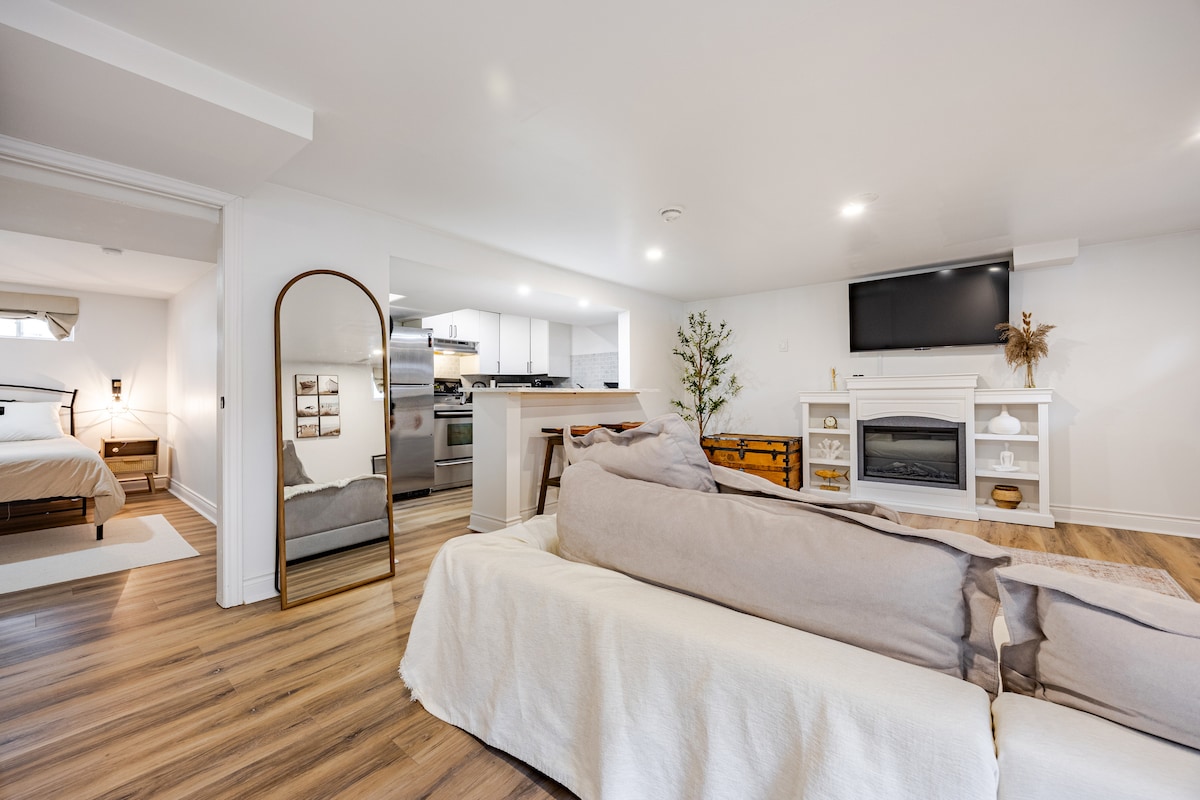 COZY and INVITING, this modern suite is in a quiet, family-friendly Ajax neighborhood. Just 10 minutes to Thermea Spa and Ajax GO Station, and a short walk to parks, shops, and groceries. Newly built with deluxe finishes, the 1,000 sq. ft. space includes in-floor heating, an electric fireplace, a spacious sofa, and smart TV with Netflix/Prime. Downtown Toronto is 35–45 mins by car, and Pearson Airport or Mississauga in about 55 mins.