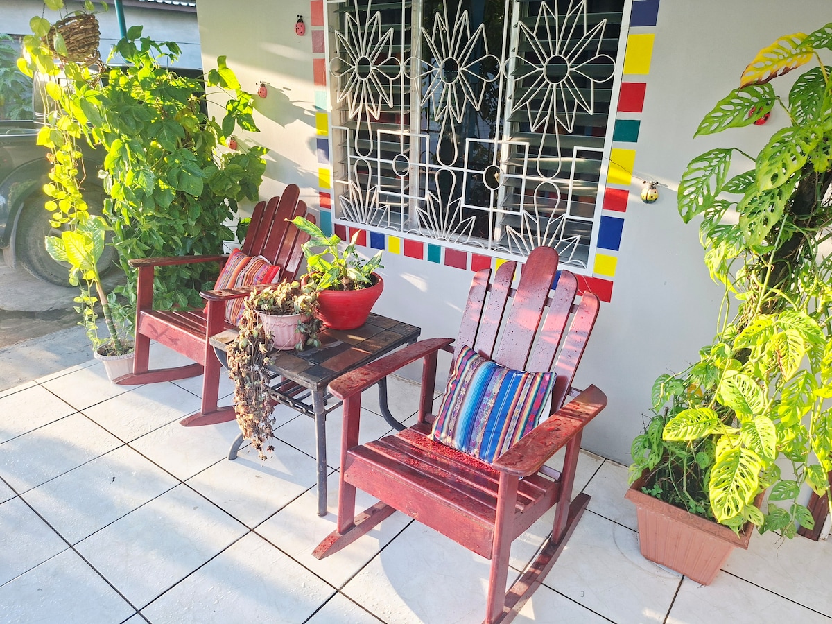 Nestled away in the lush jungle of the Rio Cangrejral with gorgeous mountain views on 1.7acres of beautiful gardens, our house has a 1 bedroom apartment downstairs and a studio upstairs, both places have hot and cold water, fully equipped kitchen, very private and safe location within in 5 minutes walking distance to Omega Lodge and Adventure Tours, with bar, restaurant, wifi, and all sorts of outdoor-adventures, please book ahead.