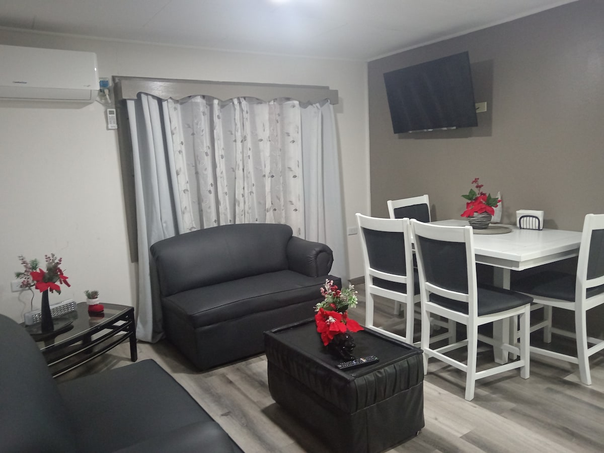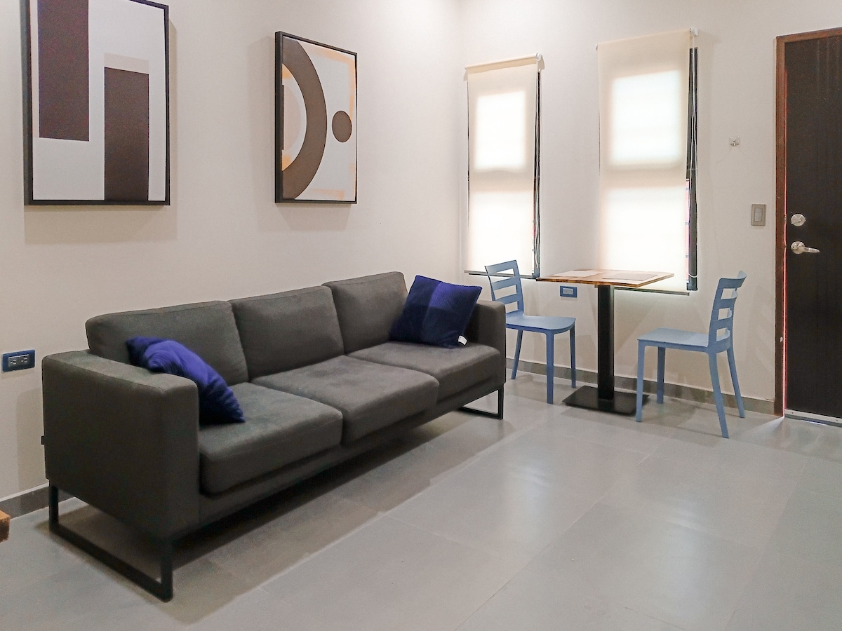 Encantador apartamento nuevo con una estancia acogedor de una pieza amueblado perfecto para disfrutar con tu acompañante, con cocina equipada (refrigerador, microondas, estufa eléctrica, tostadora, hervidor eléctrico), baño, aire acondicionado, y un lugar de trabajo, además con un patio con hermosa vistada de un árbol de ceiba. Excelente ubicación, con acceso pavimentado: Centro - 8 min Muelle de Cabotaje - 10 min Aeropuerto Internacional Golosón - 20 a 25 min Farmacia más cercana - 3 min