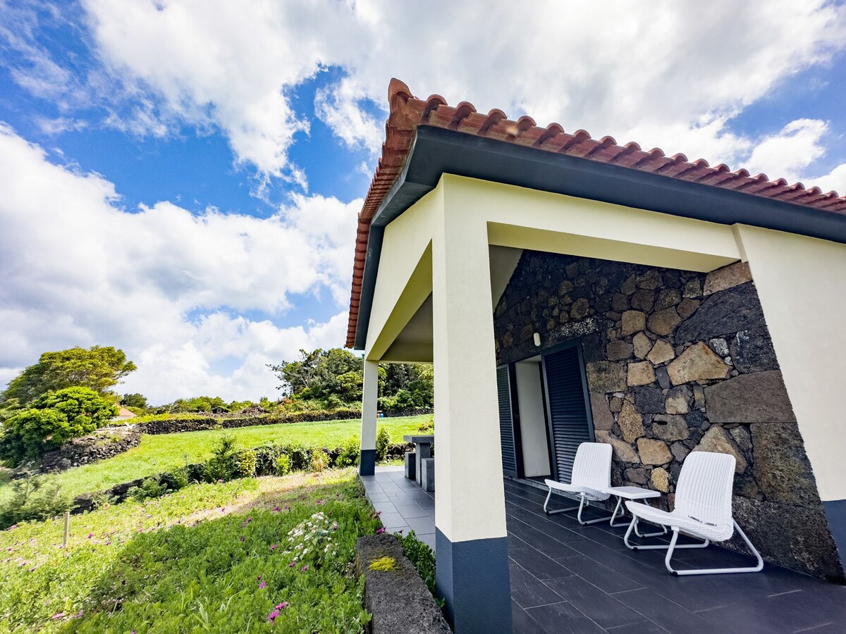 Relaxe neste cottage com um spot único e tranquilo. Aprecie na piscina, jacuzzi ou sauna a vista fantástica sobre o Faial, o mar e a vila da Madalena. Desfrute de uma linda casa em madeira num lugar único e especial com piscina, jacuzzi e sauna. Beneficie dos passeios pedestres com vista para a maravilhosa montanha do Pico. As nossas acomodações situam-se a 2 minutos de carro e 20 minutos a pé da Vila da Madalena, incluem um quarto com cama de casal e uma sala que dispõe de sofá cama.