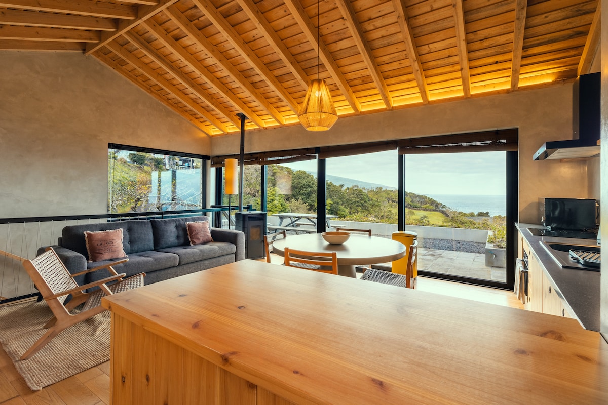 Relaxe neste cottage com um spot único e tranquilo. Aprecie na piscina, jacuzzi ou sauna a vista fantástica sobre o Faial, o mar e a vila da Madalena. Desfrute de uma linda casa em madeira num lugar único e especial com piscina, jacuzzi e sauna. Beneficie dos passeios pedestres com vista para a maravilhosa montanha do Pico. As nossas acomodações situam-se a 2 minutos de carro e 20 minutos a pé da Vila da Madalena, incluem um quarto com cama de casal e uma sala que dispõe de sofá cama.