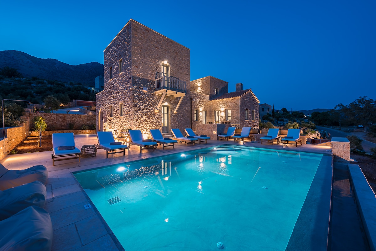 This distinguished retreat seamlessly blends panoramic sea vistas, tranquil gardens, and timeless stone architecture with an infinity pool, alfresco dining, and sumptuous interiors, creating an exquisite sanctuary. Designed to host up to 8 discerning guests across four meticulously styled bedrooms, it offers a harmonious fusion of indoor and outdoor living. Perfect for all-season escapes, this self-catering haven fuses traditional Maniot heritage with refined modern elegance.