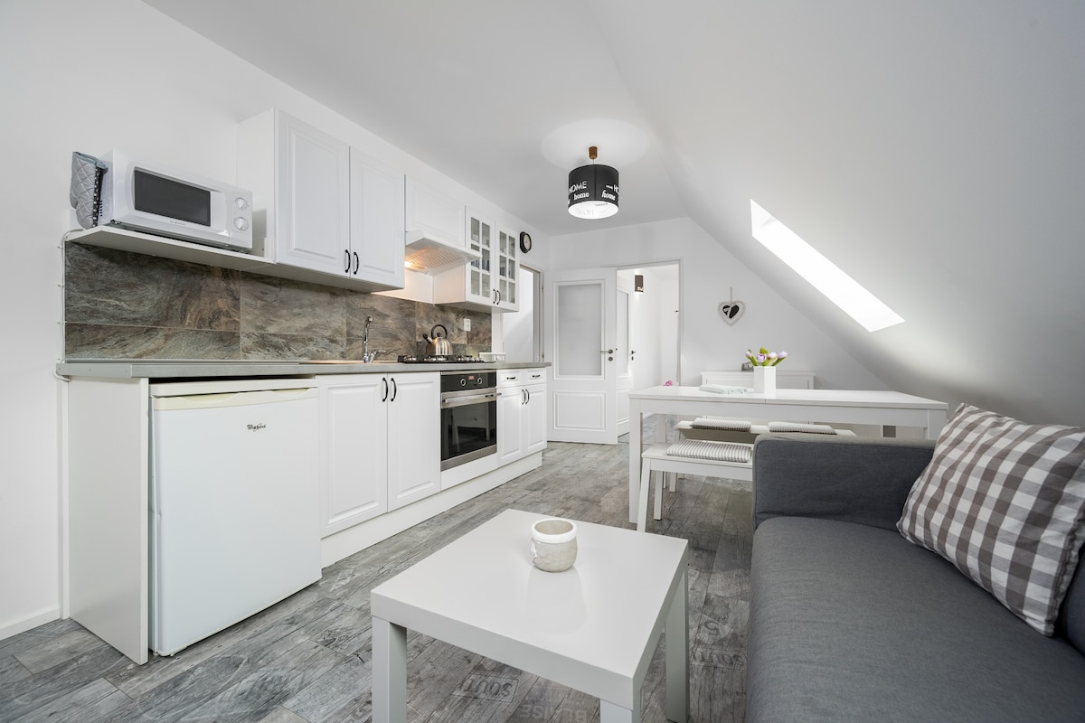 Wyjątkowe nowoczesne słoneczne mieszkanie na poddaszu, 75 m2, antyki i nowoczesność. Panorama gór, secesyjna willa, cicha ulica, z zagospodarowanym ogrodem. Ogromny salon 45m2 stropy, belki stropowe, dwie wnęki, kominek na drewno, piętro wyżej. Satelita Jadalnia Wyposażona kuchnia. przestronna sypialnia, 2. sypialnia wnęka rozkładana sofa Balkon na południe, widok na ogród z grillem Schowek na odzież na narty i rowery. Wiele atrakcji. Nie mogę się doczekać by cię zobaczyć!