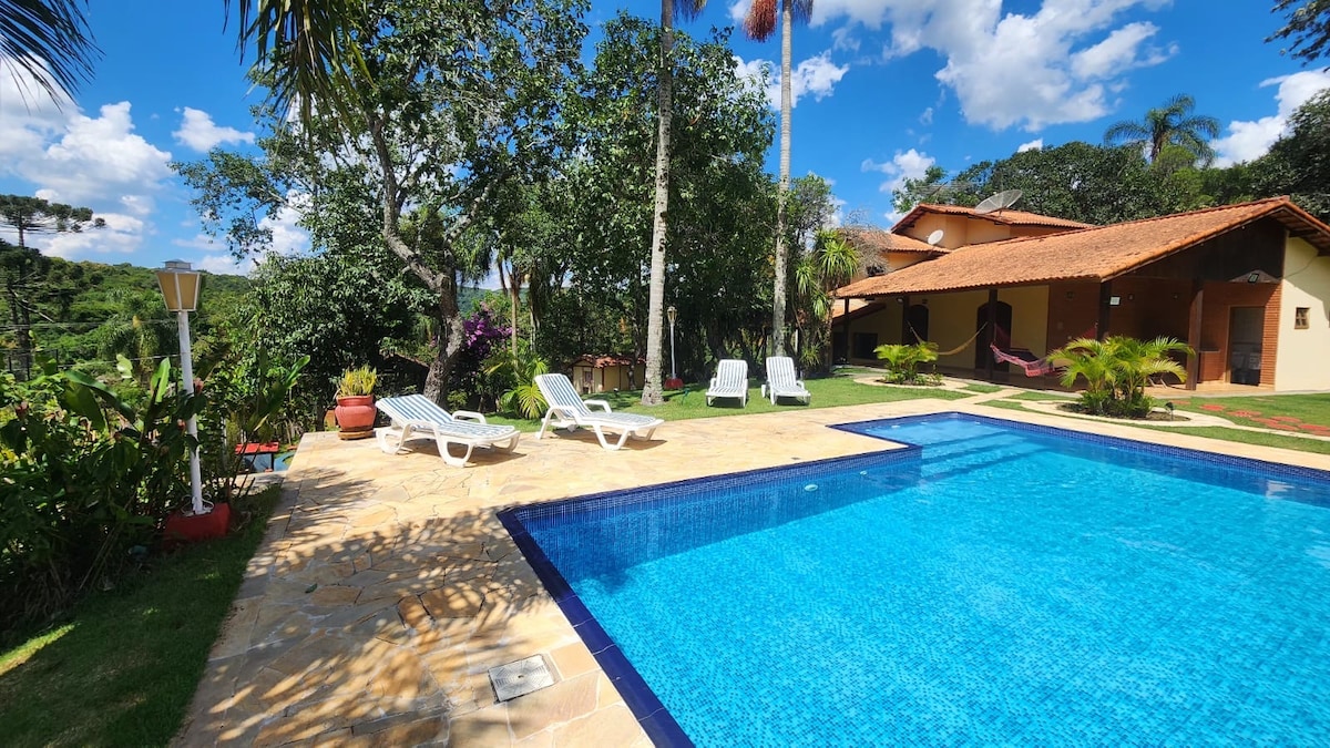 🚩Pague sua viagem em até 6 x SEM juros Casa de Campo ILUMINADA, arejada e confortável COND.FECHADO c/ vigilância 24h 5 QUARTOS, sendo 1 suíte c/ hidro 5 BANHEIROS + lavabo Salas, quartos, banheiros no TÉRREO Um BERÇO Área c/ churrasqueira, forno de pizza, fogão a lenha e cervejeira Sala c/ LAREIRA FOGUEIRA(deixamos montada) PISCINA (10m x 4m, sem aquecimento) Gramado c/ GOLZINHO INTERNET fibra óptica(400MB) COMÉRCIOS próximos ACESSO por estrada pavimentada PET friendly (casa cercada)