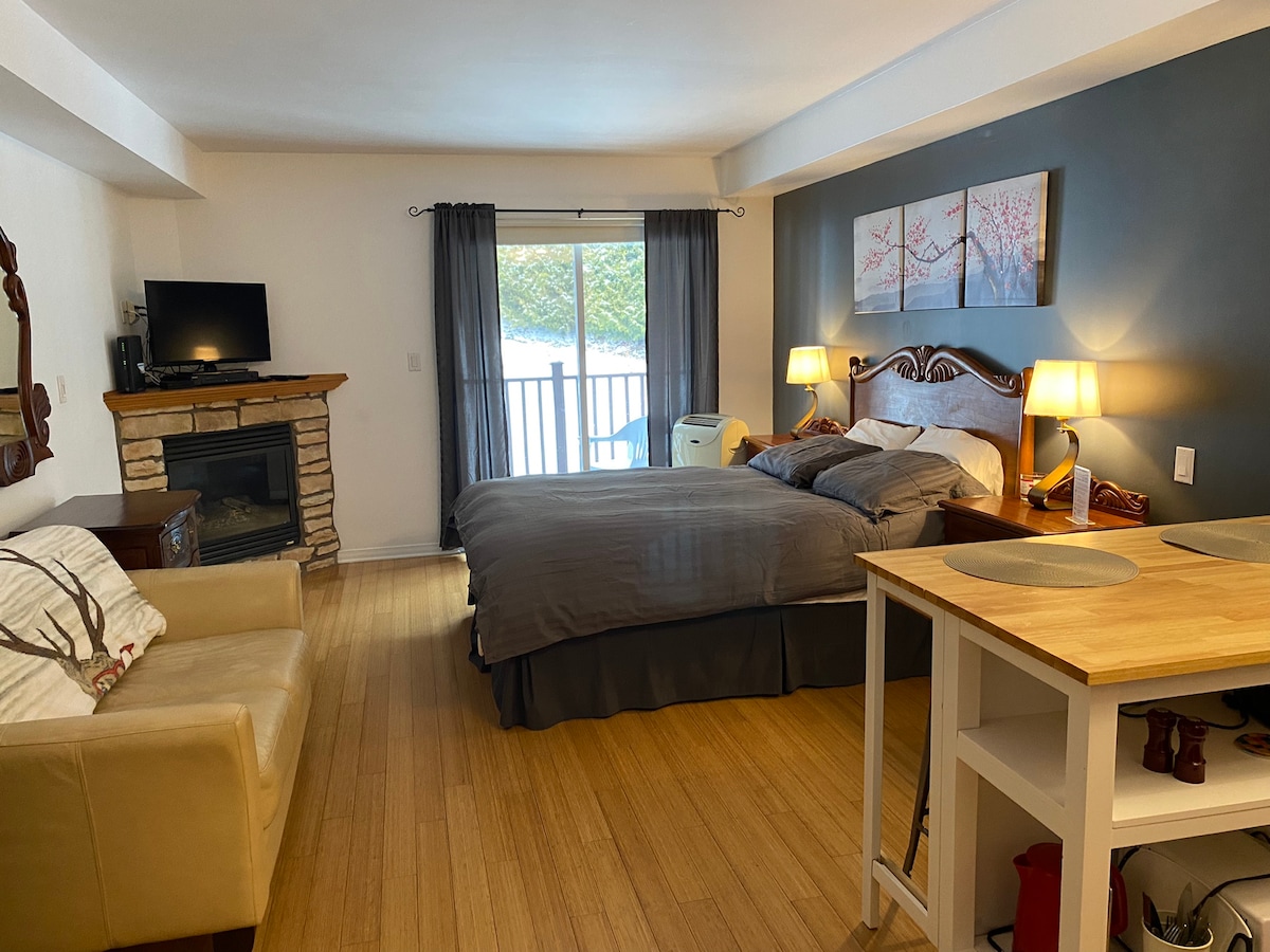 Ce magnifique studio de 340 pieds carrés est situé dans le vieux village de Mont-Tremblant. …..Fermeture …..de la piscine le 25 septembre le spa 15 octobre Tout rénové et redécoré, entièrement équipé ( cuisine complète) est parfait pour une escapade romantique! De nombreux restaurants et boutiques ainsi que la plage du lac Mercier se trouvent à moins de 10 min à pied.Le suberbe mont tremblant est à seulement 8 minutes en voiture.ainsi qu' une superbe piscine et spa.