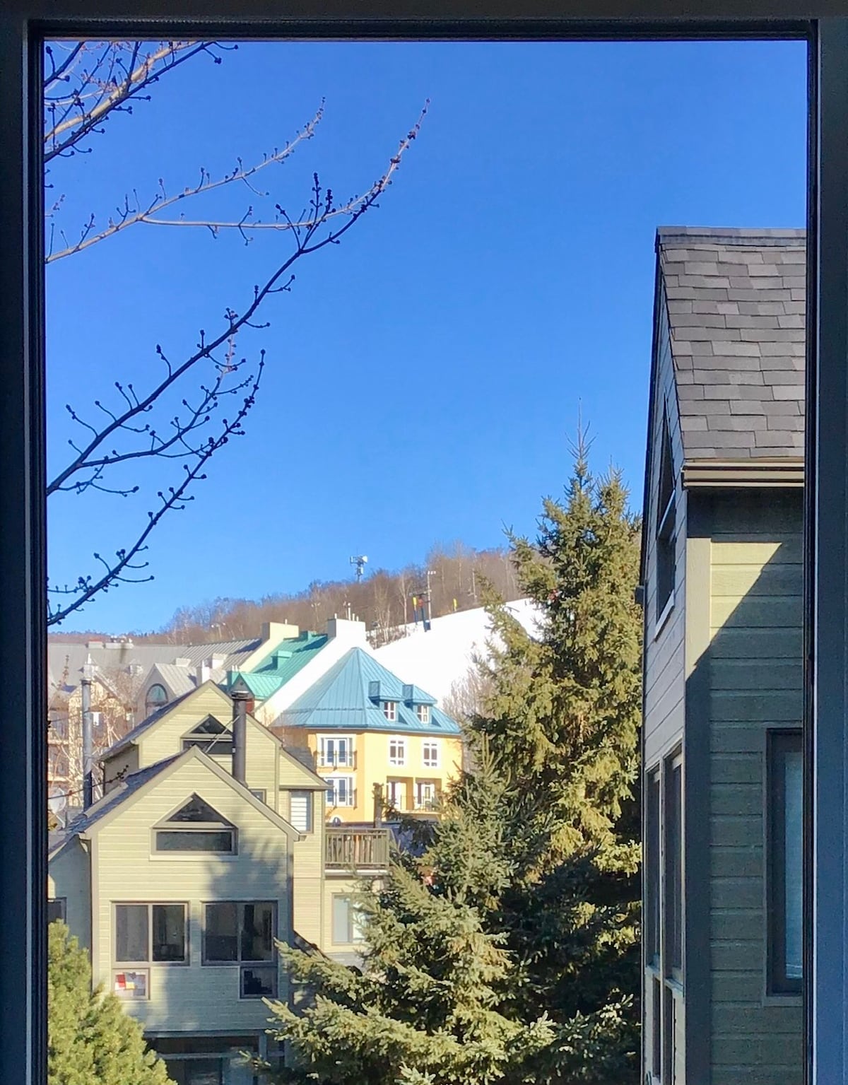 Ski in/out on Plateau trail, shuttle to village, fireplace, heated floors & jetted tub! Great for year round getaways! In the Plateau complex & 10 min walk to Pedestrian Village. The complex has a winter ice rink & seasonal pool. Private & quiet location with the ability to hike & go for walks in nature. Real fireplace, living room AC unit and amazing views from the back deck. Complimentary bus from the condo complex to Pedestrian Village (schedule varies). Quiet and cozy condo.