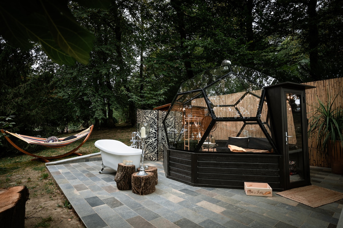 La sfera geodetica nel mezzo di un bosco con una vista mozzafiato e la vasca Idromassaggio esterna ad uso esclusivo. La sfera è dotata di un letto matrimoniale, un'area relax dove poter gustare in pace una tazza di caffè o tè.Lontani dal turismo di massa in contatto diretto con la natura senza dover rinunciare il comfort.Le sfere sorgono in prossimità di un casale ottocentesco dove sono posizionati anche i bagni, nel mezzo di un bosco di 10ha con le varie aree relax e angoli meravigliosi.