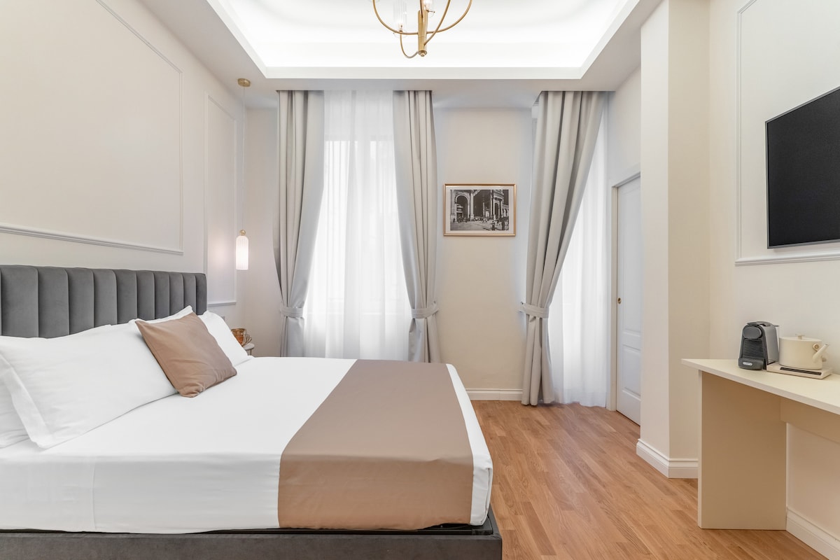 Our Double Suite welcomes you with modern style and unparalleled historic views. Equipped with a TV and desk, to meet your every need. The lovely private bathroom in the room, is an oasis of relaxation. The private terrace offers a breathtaking view of the Columns of San Lorenzo and the Basilica, allowing you to immerse yourself in Milan's rich history. This space is ideal for relaxing and admiring the city.