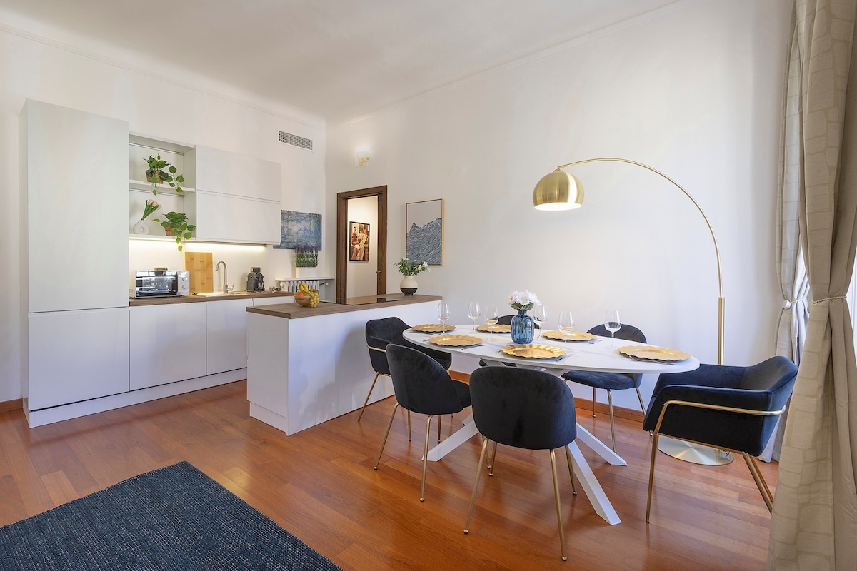 Spacious, bright, and finely furnished, Vogue Apartment blends Milanese charm with contemporary design. The warm tones of the parquet flooring and the modern details create a harmonious and welcoming atmosphere, accommodating up to 7 guests. Every area has been designed to offer comfort, style, and a refined stay experience in the heart of the city.