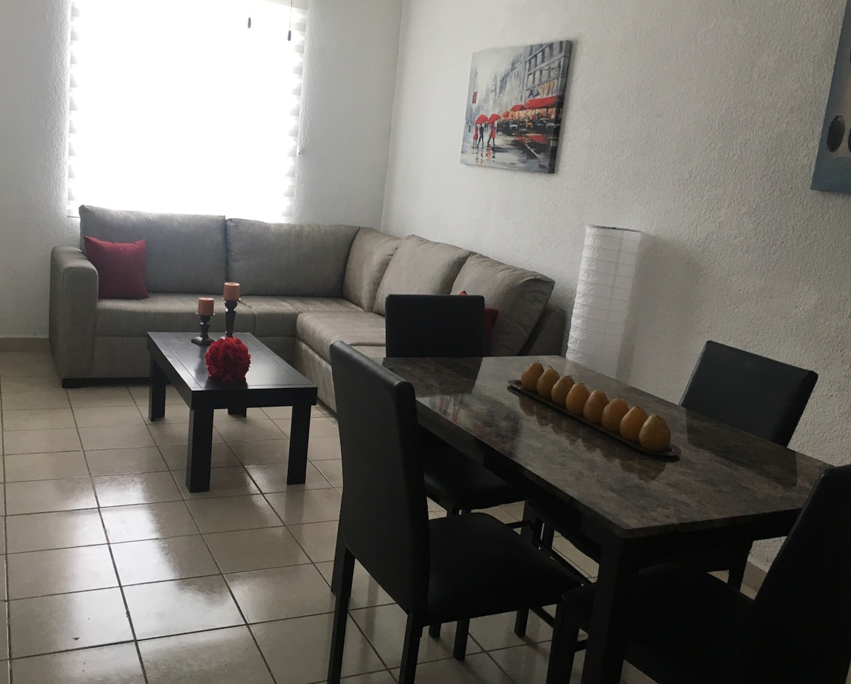 Departamento confotable con una habitación, cuenta con una cama matrimonial , cocina y baño área común con barra desayunador tanto en el área común como en la habitación cuenta con aire acondicionado frío/calor. Hay agua caliente e internet de fibra óptica, la entrada tiene caja de llaves con combinación para que no te preocupes en la hora de llegada El departamento cuenta con cámaras de seguridad en el exterior para la misma seguridad.