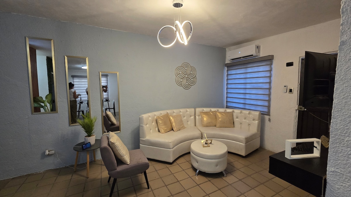 Disfruta de un pequeño y acogedor apartamento que se encuentra a solo 3 min de la famosa Macroplaza; que está rodeada de restaurantes, gimnasios y establecimientos comerciales, tales como: OXXO, Farmacia Guadalajara, Walmart, y Coppel. Si quieres cruzar a la frontera, el Puente Internacional está a solo 8 minutos con carro. Cocina equipada, aire acondicionado, calefacción, estacionamiento privado y una terraza/palapa de área común con asador costo aparte. Ponte en contacto conmigo.