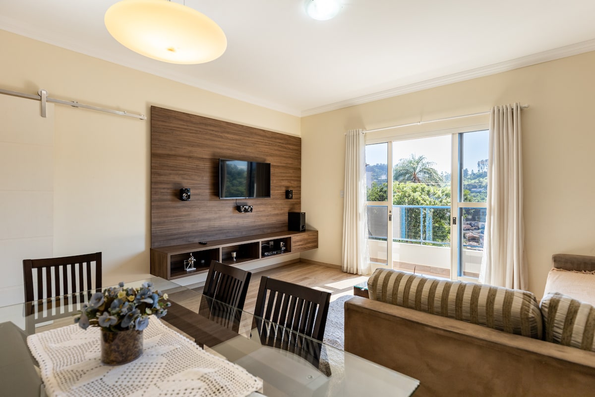 O apartamento novinho e TOP que a sua família precisa para desfrutar de momentos deliciosos em Serra Negra. Acomodação para 5 pessoas distribuídas em dois quartos (cama casal + triliche), cozinha americana, sala, banheiro, varanda com uma vista livre e linda para a natureza. Possui estacionamento, piscina, churrasqueira e salão de jogos. Fica a 5 min do centro de Serra Negra (Praça Sesquicentenário), de carro. Relaxe com toda a família!!!! Dúvidas? Me Pergunte!