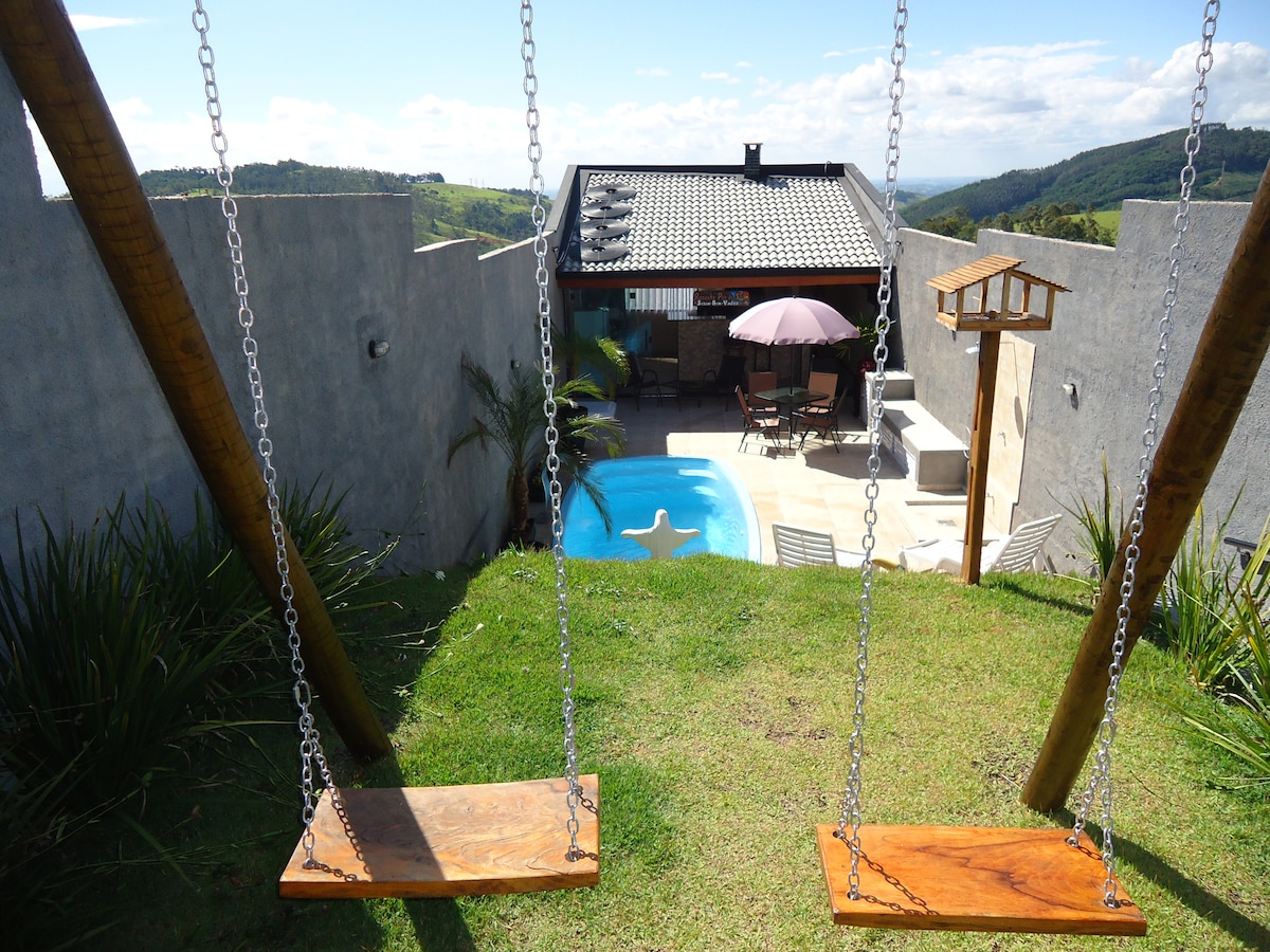 VISTA PANORÂMICA E PRIVILEGIADA PARA O PÔR DO SOL, MONTANHAS, VALE E CIDADES VIZINHAS! POSSUI 01 SUITE COM TV BOX, CAMA DE CASAL E 02 CAMAS DE SOLTEIRO, ARMÁRIOS, FRIGOBAR, PISCINA , CHUVEIRÃO EXTERNO, SALÃO DE JOGOS (MESA DE SINUCA E PEBOLIM), BALANÇOS PARA CRIANÇAS E ÁREA GOURMET COM CHURRASQUEIRA. POSICIONADA PRÓXIMO A TODO COMÉRCIO EM GERAL NA CIDADE. SERÁ UM PRAZER RECEBÊ-LOS EM NOSSO ESPAÇO. VENHA CONFERIR!