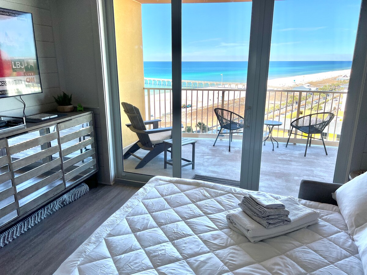 Complimentary Beach Chair & Umbrella service included (Mid March-October) Located BEACHFRONT near Pier Park, this 1 bedroom 1 bath studio has everything you need; a full kitchen, private 5th floor balcony overlooking the Ocean, High Speed WiFi, Cable TV, Pool (heated in Winter) Onsite Laundry and BBQ Grills. Free Parking is right in front of the condo so no long walks to/from your car or waiting for the elevator! Located across the street from Gulf World, its close to restaurants and shopping.