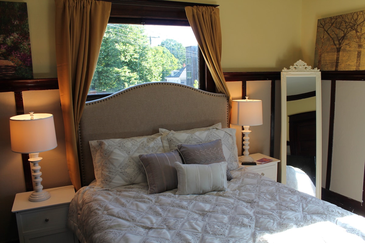 This charming studio cottage sits nestled under a willow tree; creating a mood of serenity. The queen sized bed has a memory foam mattress, & luxury linens. The kitchenette has fridge, microwave, Keurig machine, & electric hot plate. Through the window you’ll see the rustic playhouse & gazebo. The bathroom with shower is sparkly clean. Spacious parking—only a few feet from the cottage. Whether you’re here for a concert or a graduation, this little house will enhance your visit. Fan/no AC