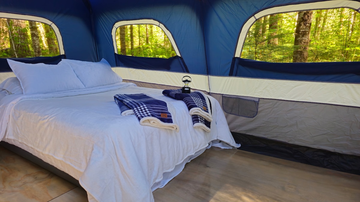 Just minutes from Mt. Rainier National Park, this secluded forest glamping spot features a queen bed with heated mattress, wood floors, and soft lighting. Enjoy shared access to a covered hot tub, grill, fireplace table, and a luxury shower with rainshower head. The tent is set apart in a private pine grove. Peaceful, cozy, and perfect for reconnecting—with nature, your partner, or yourself.