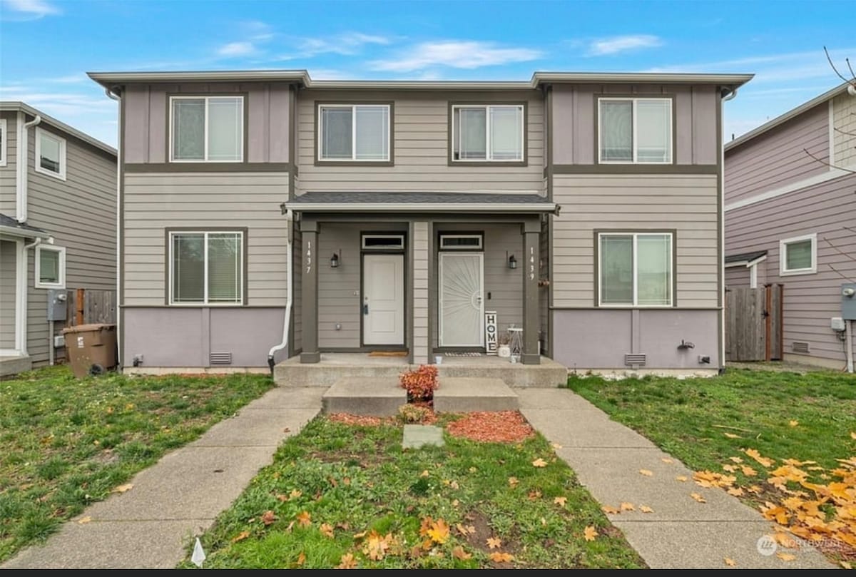 Experience contemporary comfort in this stylish townhouse with fast Wi-Fi and AC. Enjoy an open-concept living area w/ high ceiling. Main Floor offers a King bedroom, while upstairs has a full bedroom, second living room, and private office. Laundry in Unit & fenced patio. Perfect for travelers who want a home with easy access to local amenities and a remote working w/ the office. What's nearby ✨ *Tacoma Mall - 3 min drive *Tacoma Dome - 2 min drive *St. Joseph Medical Center - 5 min drive