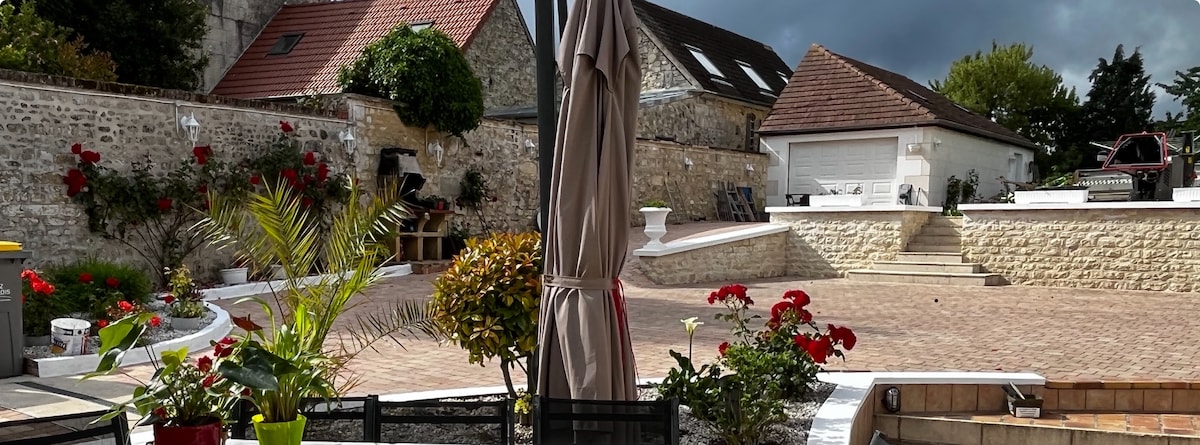 Logement deux pièces dans dépendance sur cour, avec charme des pierres, tout équipé (télévision, RMC Sport, wifi, électroménagé...). 15min de l'aéroport Roissy CDG, 20min du parc Astérix en voiture. 14min du parc des expositions de Villepinte en voiture. 20min de la gare RER D à pied (30min de Paris) Au cœur du village historique avec toutes commodités (restaurant, épicerie, tabac, boucherie, église, musée ARCHEA...). Calme assuré.