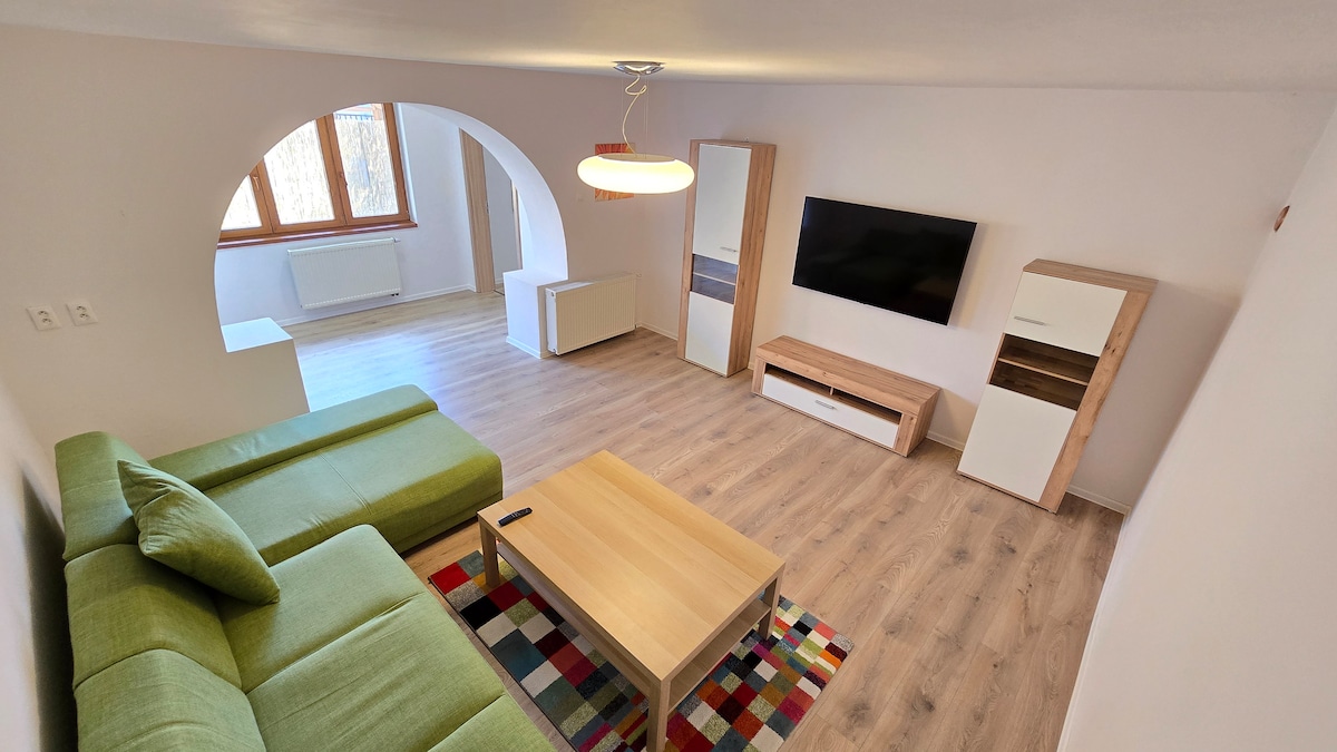 Cozy attic apartment in a house with a private entrance, located in a quiet area. Just minutes from Kalnica Bikepark, Zelená Voda Lake, and medieval castle ruins. The apartment features three rooms, each with a TV, internet, and Netflix. Enjoy fast Wi-Fi, a fully equipped kitchen, and a bathroom with a shower, bathtub, and washing machine. Parking in front of the house, and a garage for bikes. Grocery shopping can be arranged on request. A great choice for both relaxation and adventure.