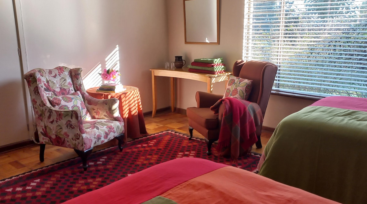 This cabin offers a quiet escape from the hustle and bustle despite it's central location. Inside, you’ll find modern furnishings, quality linen, airconditioning, a solar backup inverter, and all the comforts you need for a restful stay. Step out onto the deck and watch the birds in the garden, set against views of the Drakensberg mountains. Just minutes from hiking trails, the Midmar Dam and local shops, this cabin is ideal for romantic getaways, working retreats, or small family adventures.
