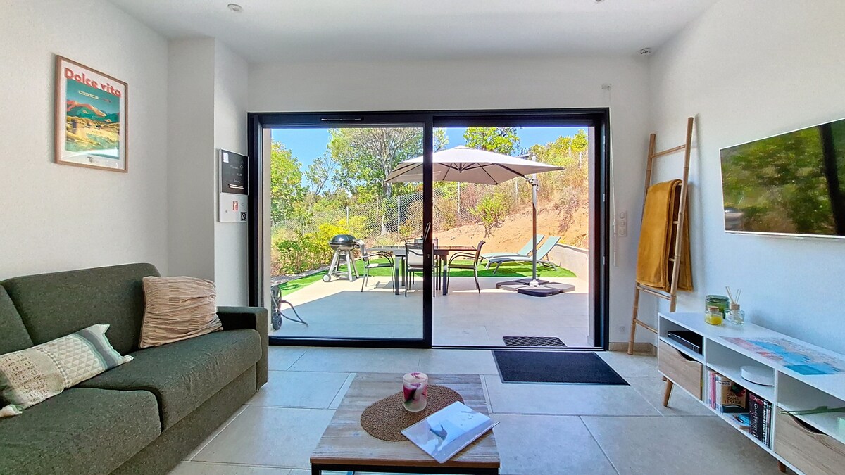 Maison neuve 4 personnes/vue mer panoramique golfe d'Ajaccio/ jardin arboré privatif 500M2. A 20 min d'Ajaccio, entre la station balnéaire de Porticcio et la presqu'ile d'Isolella. Proximité immédiate des plages, commerces et restaurants.Villa de 60m2 climatisée comprenant: un séjour avec cuisine ouverte équipée donnant sur la terrasse aménagée avec vue mer, 2 chambres avec dressing, deux salles de bains, avec wc. Vue imprenable, couchers de soleil sur les îles sanguinaires. Plage à 400m à pied.