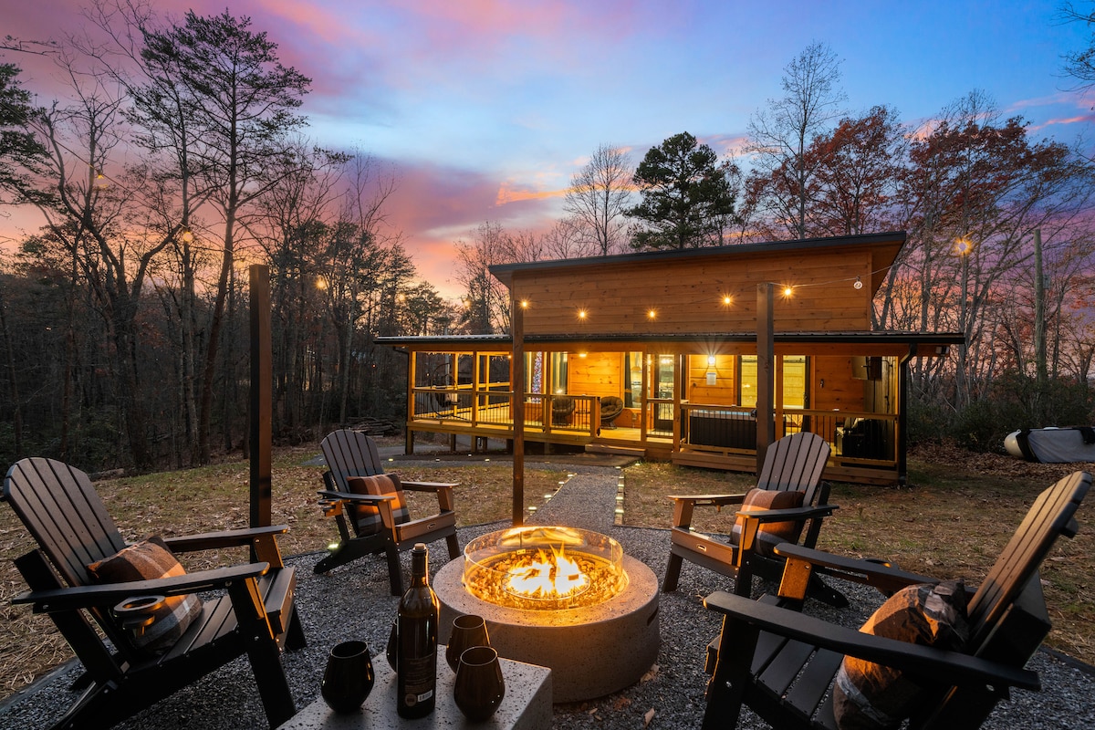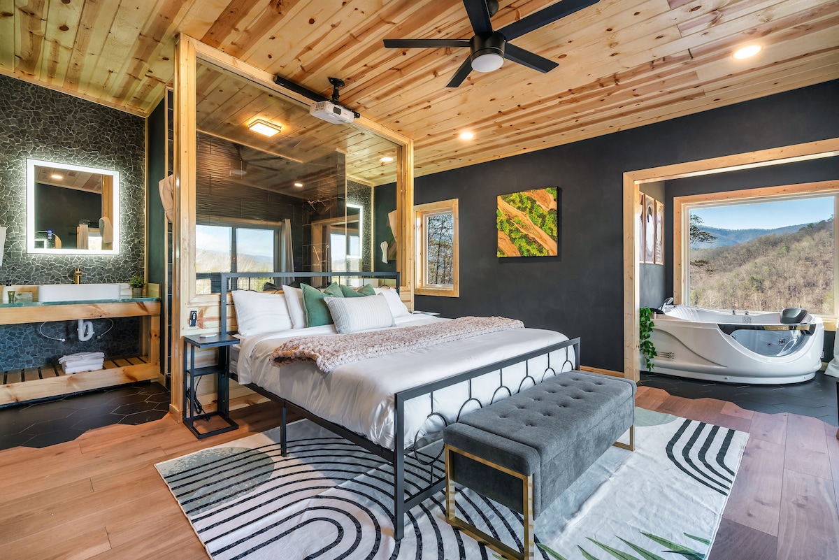 ✅ Centrally Located (8 miles to Dollywood or 8 miles to Gatlinburg) ✅ Hot Tub ✅Mountain views ✅Firepit ✅Electric Fireplace Inside ✅Smart TV ✅Wet room (soaker tub and shower) ✅Charcoal Grill ✅Frisbee Golf ✅Covered porch with rocking chairs ✅Brand New Modern-Compact Studio Cabin (550 sq ft) ✅King Bed w/luxury bedding ✅Washer/Dryer, Dishwasher, Oven, and Fridge! ✅Vintage board games ✅Record Player
