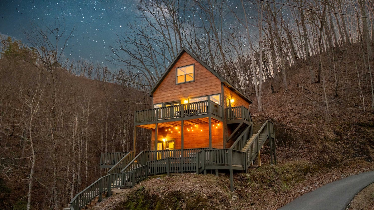 Escape to The Nocturnal Nest, a hidden gem 💎 tucked away amidst the beauty of nature🍃. This cozy cabin offers an idyllic escape for lovebirds celebrating milestones or simply for the fun of it🥰! Create your own luxurious paradise🍹🏝️at home with a personal theater, spacious outdoor patio with a fire pit, hot tub, and BBQ grill. 📍17 min to Pigeon Forge 📍25 min to Gatlinburg 📍57 min to Knoxville ✈️ 📍18 min to Dollywood 🎢 📍24 min to National Park 🌲 📍30 min to Ober Ski Mountain 🏂⛷️