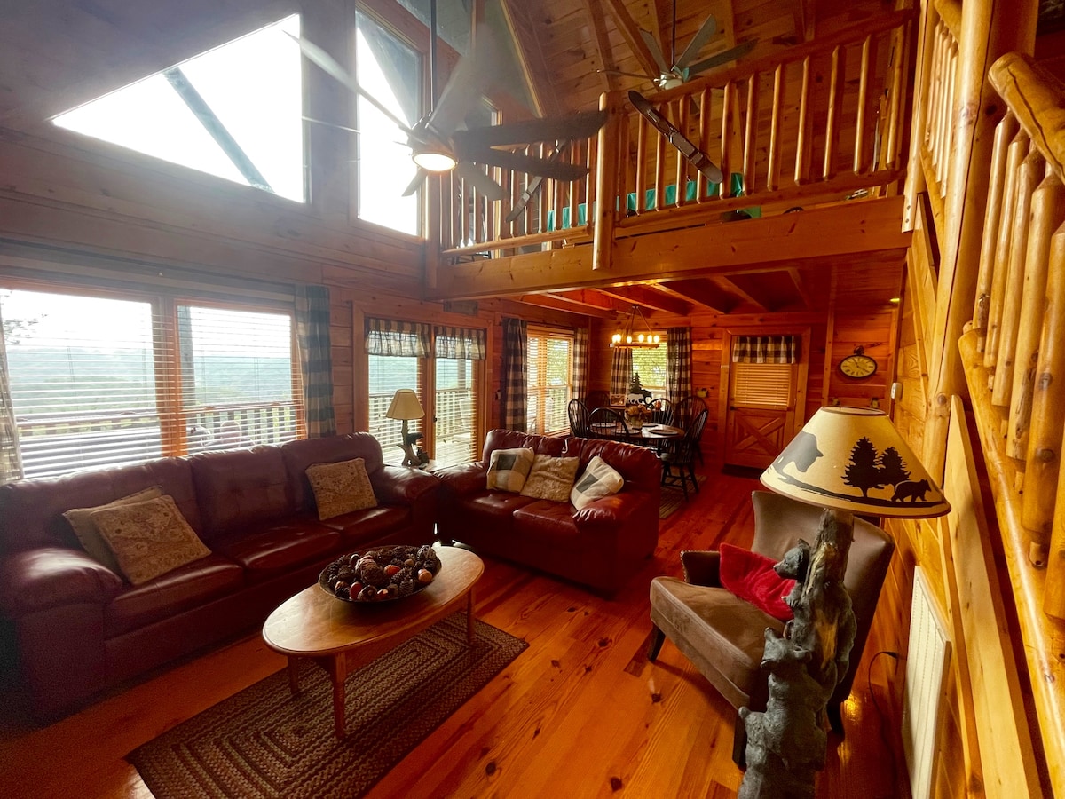 SkyView Lodge is a log cabin built with a view of the Cherokee National and the Smoky Mountain National Forest. Its design maximizes enjoying the incredible views from every room. Ideally located close to white water rafting, zip-lining, hiking, & scenic drives. Within driving distance of the cities of Gatlinburg (35 min), Pigeon Forge (40 min), Tennessee, & Asheville (1 hr) & Hot Springs, NC The Foothills Parkway can be seen from the property. Visit our Youtube channel for a walk through