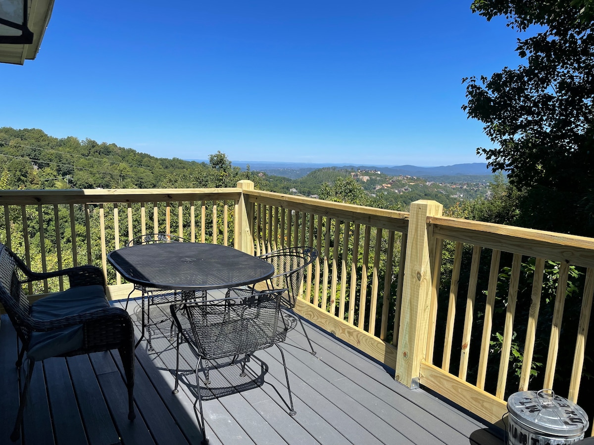 Chalet Vista Hermosa sits high, overlooking the majesty of the GSMNP. All the rooms in the Chalet have views of the mountains. VIEWS, VIEWS & MORE VIEWS Main level - living room with two couches, dining room, kitchen, fireplace, restroom, deck with seating and balcony outdoor dining. 1st landing Master sitting area, fireplace, recliner, bathroom with double vanity, balcony with outdoor seating & dining table. 2nd landing two guest bedrooms 2 queens, 2 twins & trundle 4 car parking.