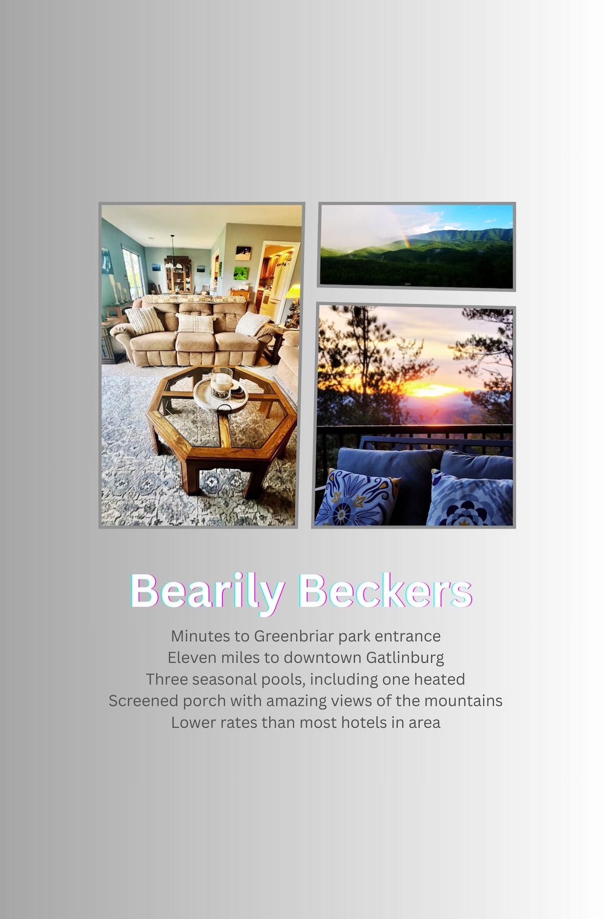 🐻 Bearily Beckers is a peaceful Smoky Mountain getaway in the scenic Cobbly Nob area, known for its beautiful views and quiet setting. Just 20 minutes from Gatlinburg and 10 minutes from the Great Smoky Mountains National Park, it’s perfectly located for both relaxation and adventure. Enjoy nearby hiking trails, waterfalls, three seasonal pools, golf, pickleball, shopping, and dining—with easy access to Gatlinburg and Pigeon Forge. A cozy retreat close to everything, yet tucked away in nature.