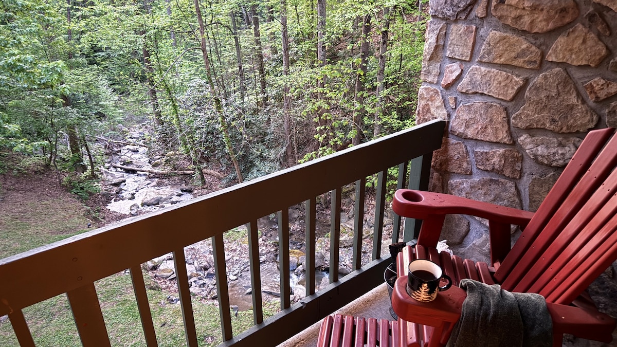 River Retreat is a beautiful condo on the river, close to town, and ready for your Smoky Mountain Getaway. We have included everything you need to relax and renew. The condo features a King sized bed with a balcony overlooking the river. The perfect spot to enjoy your morning coffee or a good book. The bathroom is spacious with double sinks, a shower, and Jacuzzi tub. The den feautres valuted ceilings with plenty of windows for natural light. Close to town but feels like a world away.
