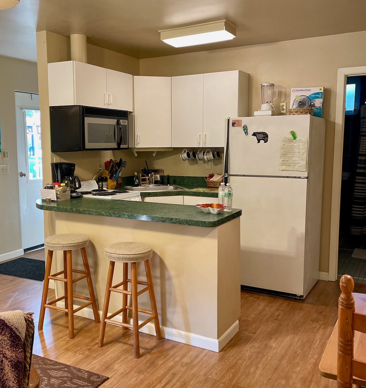 The Green Door Cottage is a peaceful place to relax and unwind. We strive to provide a clean and fun place to make your home during your vacation! There is plenty of room to accommodate 6 to 8 people, with a master bedroom with bathroom attached, and 2 other bedrooms that share a bath and a half. The most amazing part of our cottage is outside. There is a back porch with gas grill, hot tub, fire pit and even a 9 hole Disc Golf course!