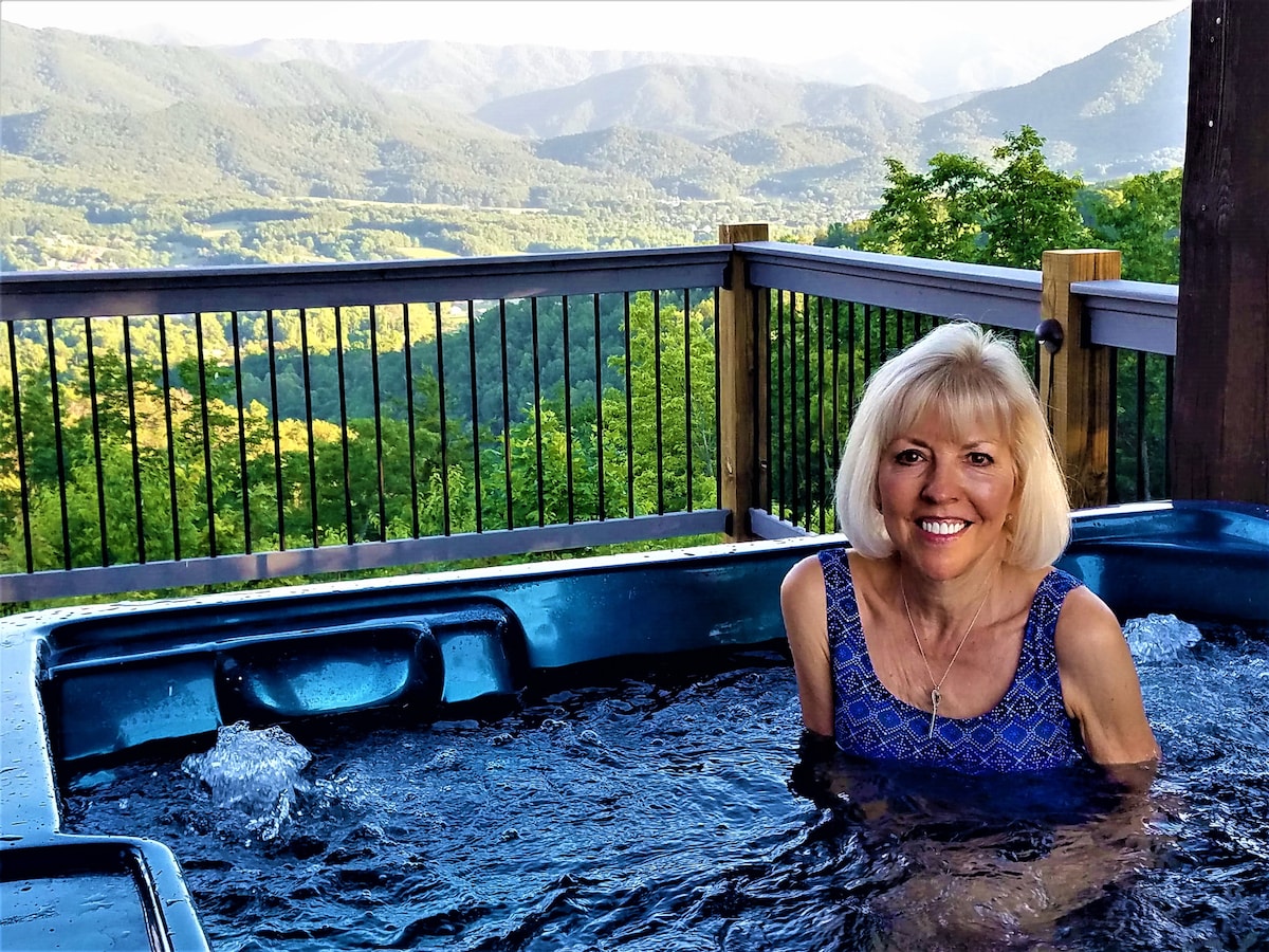 Stunning views out FRONT and BACK of spectacular newly rebuilt Smoky Mt. Cabin. 2 King BR master suite, plus loft with King & sleeper sofa. Mountaintop off Hwy 321: 7 miles to Pigeon Forge, 16 miles to Gatlinburg . Easy drive up a great road in Wears Valley. Back roads avoid Parkway traffic. Wraparound Trex Deck w/ Hot tub. Outdoor Kitchen in gazebo, firepit. Indoor jetted tub. Rustic luxury. Gourmet kitchen. Active duty and retired Military, Law Officers, firefighters 10% off.