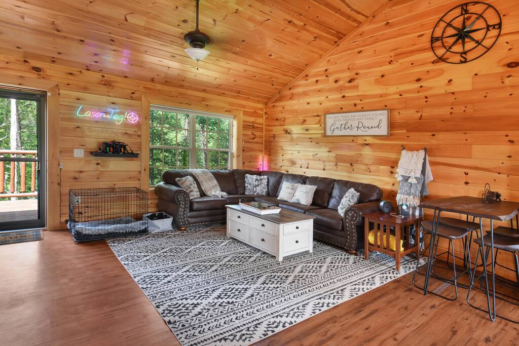 ★ Minutes to iconic attractions! ▸ 7 Miles to Smoky Mountain National Park ▸ 7 Miles to Pigeon Forge parkway ▸ 9 Miles to Dollywood ▸ 12 Miles to Gatlinburg 🌄 Stunning View of Wears Valley and surrounding mountains ♨️ Relax in Style: Hot tub, gas fireplace, wraparound deck with swing 🏠 Spacious 2,400+ sq/ft Cabin 📶 Fast Wifi - (1,000mbps) 🛏️ 3 King Beds 📺 5 Roku Smart TVs 🎮 Entertainment Galore: Arcade (150+ games), Pool table 🚗 Easy Parking for 4-5 cars 🍖 Charcoal Grill