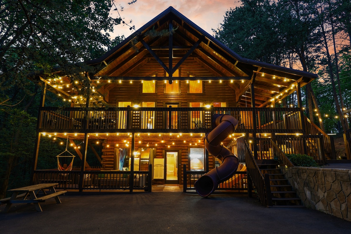😀Private Playground ⛰Year Round Views 🏅Shuffleboard. 🥷Custom Ninja Tower 💦Hot Tub 🔥Rare flat yard space 🖌Rock Painting 🎯Foosball, Darts 🌲Private 3 acres 🎲Giant Jenga 🙂Cornhole 🔥Fire Pit, Hammock ✔️Fast WiFi 🧲Horseshoes 🎶Vinyl/Bluetooth 🍗Weber Grill Long Stay Discounts Available No other cabin in the area has all this! 9mi-Pigeon Forge - 10mi-Dollywood 17mi (30 min/NOT 50) National Park & Gatlinburg