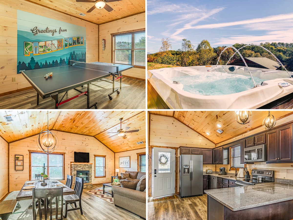 “Postcard Getaway” is a beautiful, newly-built cabin in the heart of Pigeon Forge perfect for your family vacation! - 4 Miles From Dollywood - 1 Mile From The Parkway - 1 Mile From The Island - 2 Miles From The Ripken Experience - 2 Miles From The Pigeon Forge Convention Center - Game Room w/ Ping Pong & Pac-Man - Hot Tub w/ Mountain Views - 5 Smart TVs - Smoky Mountains Mural - Fully Stocked Kitchen - Family Friendly (Pack N Play, High Chair, More) We can’t wait to host you!