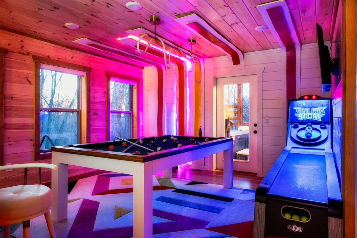家庭小木屋,配备 4 个游戏机、匹克球和热水浴缸