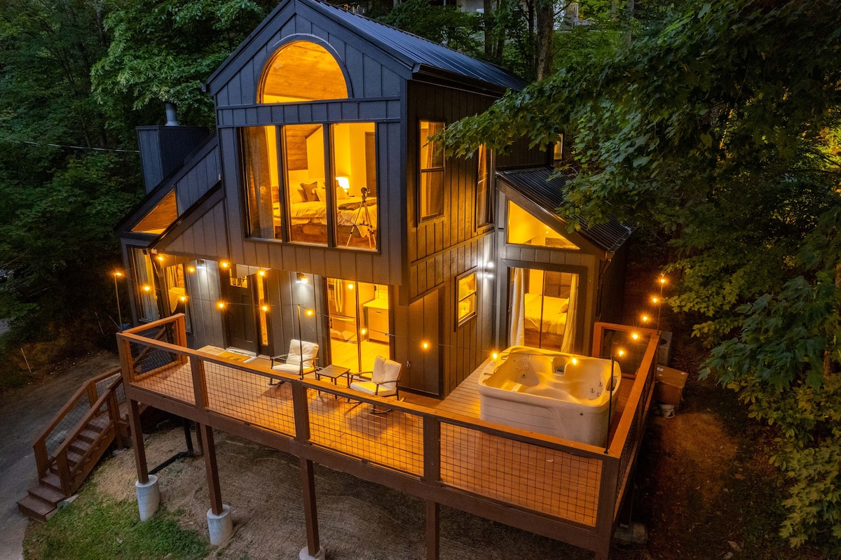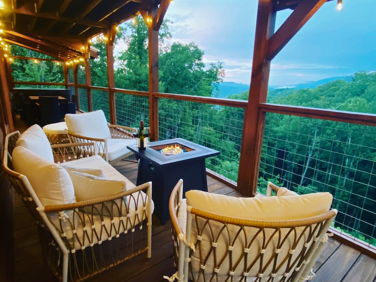 Come enjoy the spectacular views at The Overlook where you will be surrounded by trees while relaxing in this luxurious newly built cabin. Cozy up with a warm beverage while streaming your favorite show in front of the fireplace or challenge companions to a game, there is plenty to keep everyone entertained. Featuring floor to ceiling windows on both levels and 4 unique patios you will enjoy the views both inside and out with an unobstructed view. You won't want to leave this beautiful space!
