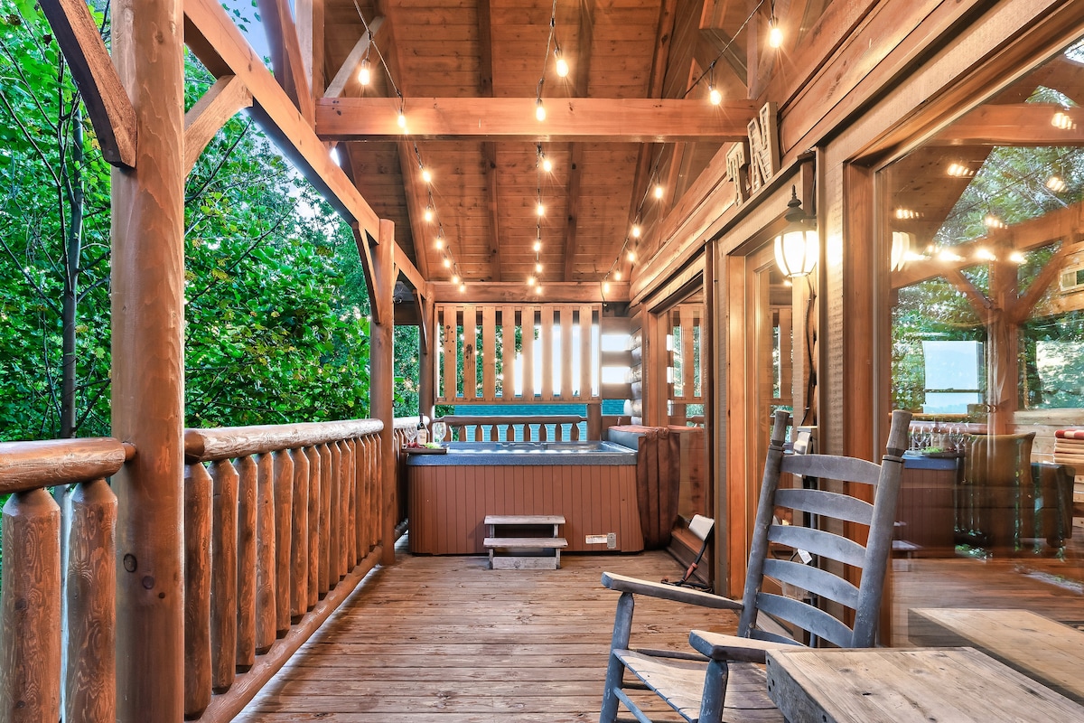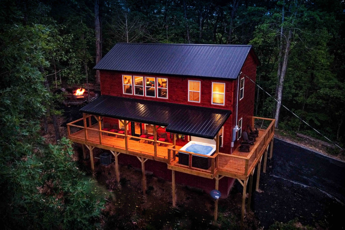 Newly built cabin in the Great Smoky Mountains. With accommodations for up to 12 guests, this unique mountain retreat offers 2 suites, a bonus room, 3 full bathrooms, and 2 half bathrooms. This 2,900 sqft cabin is outfitted with comfortable living and dining areas, fireplace, fully equipped kitchen, game room, theater, patios, balcony, and a spacious deck, where you can gather around the grill, or heated swim spa.