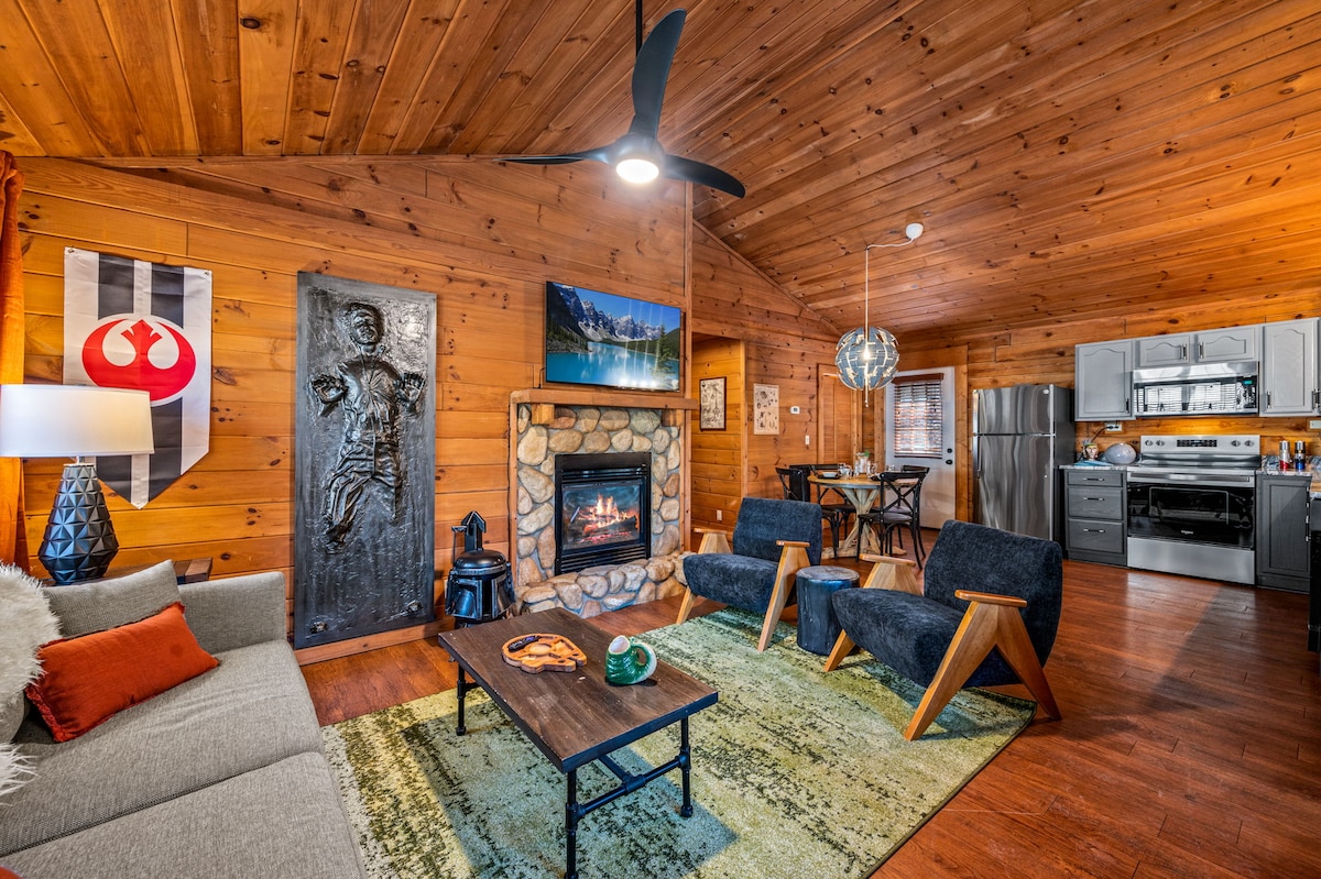 Hidden deep in the Smoky Mountain system, Rebel Refuge is a sanctuary for travelers seeking adventure and relaxation. This immersive retreat sleeps up to 5 guests, featuring a fully equipped kitchen, a cozy command center with a 4K TV and fireplace, and a deck with a private hot tub. Relics of the Rebel Alliance adorn every corner—including a certain smuggler frozen in carbonite. Whether escaping the Empire or just the ordinary, your mission begins here! 🚀✨