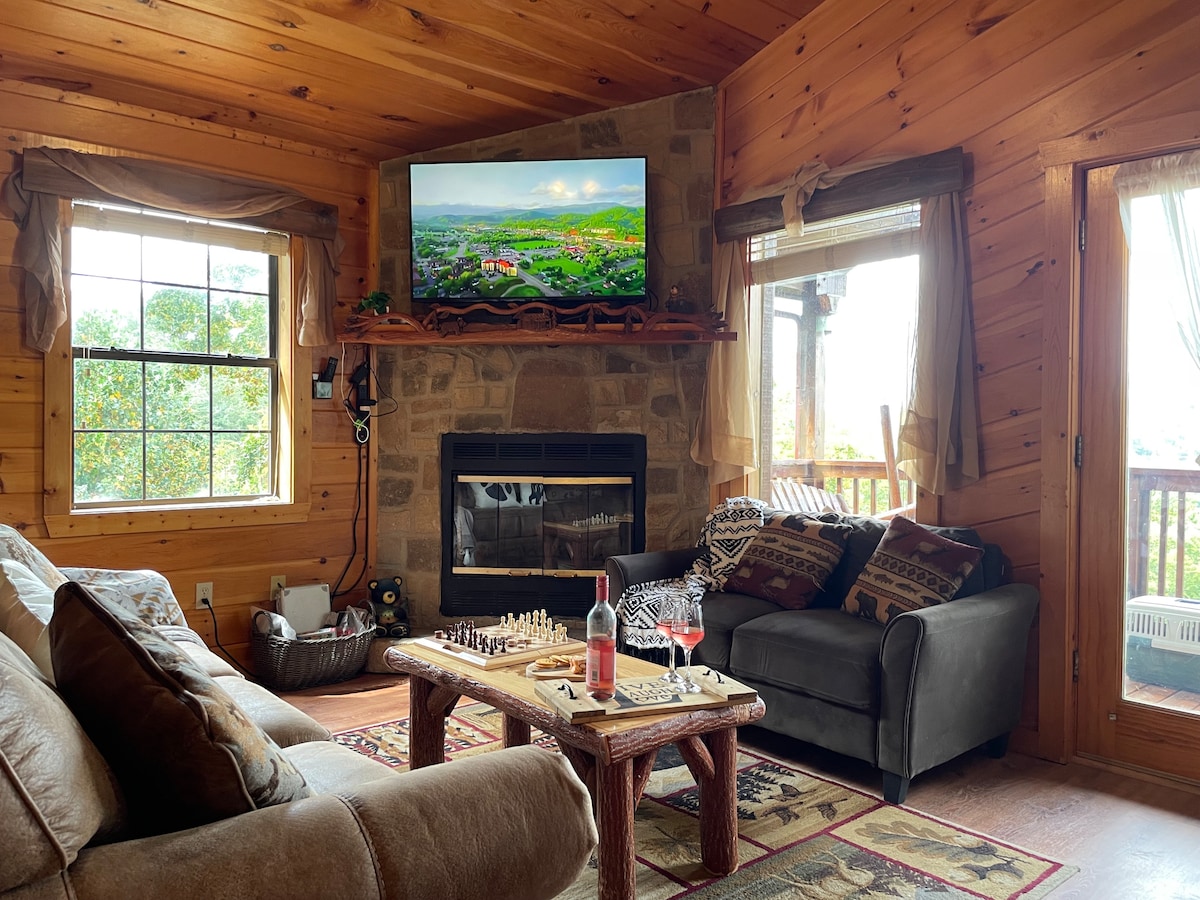 See why this cabin is Top 5% on Airbnb! Gorgeous, 1 mile to parkway and the Island! 2 spacious King Master Suites for a restful night. 2 full private bathrooms, sleeper sofa, sauna, hot tub, game room and fire pit! LOTS of amenities. You will love this open 1 level, 3 sets of French doors to the private balcony. Relax on the front porch with valley views or enjoy the hot tub in the large backyard space. The living space has high ceilings and a cozy fireplace for a retreat.