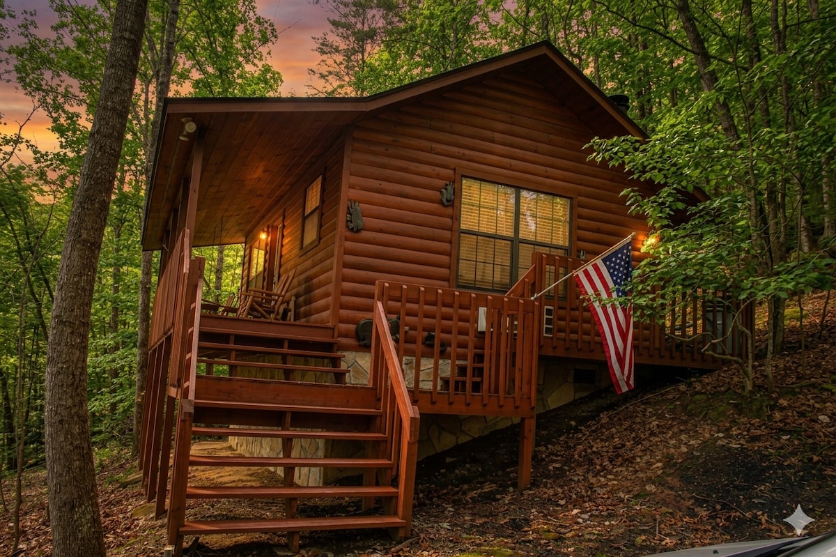 Tucked away and private, yet close to local attractions that include the Great Smoky Mountains National Park, this wood cabin retreat can accommodate up to 4 guests with 1 bedroom, 2 beds, and one bathroom. Inspired by the surrounding landscape, Moonshine Romance Cabin was designed to make your visit a unique, comfortable and fun experience. Plenty of privacy and surrounding woods here. The neighborhood streets are well paved so walking the area is easy to do. 20 minute drive to either town.