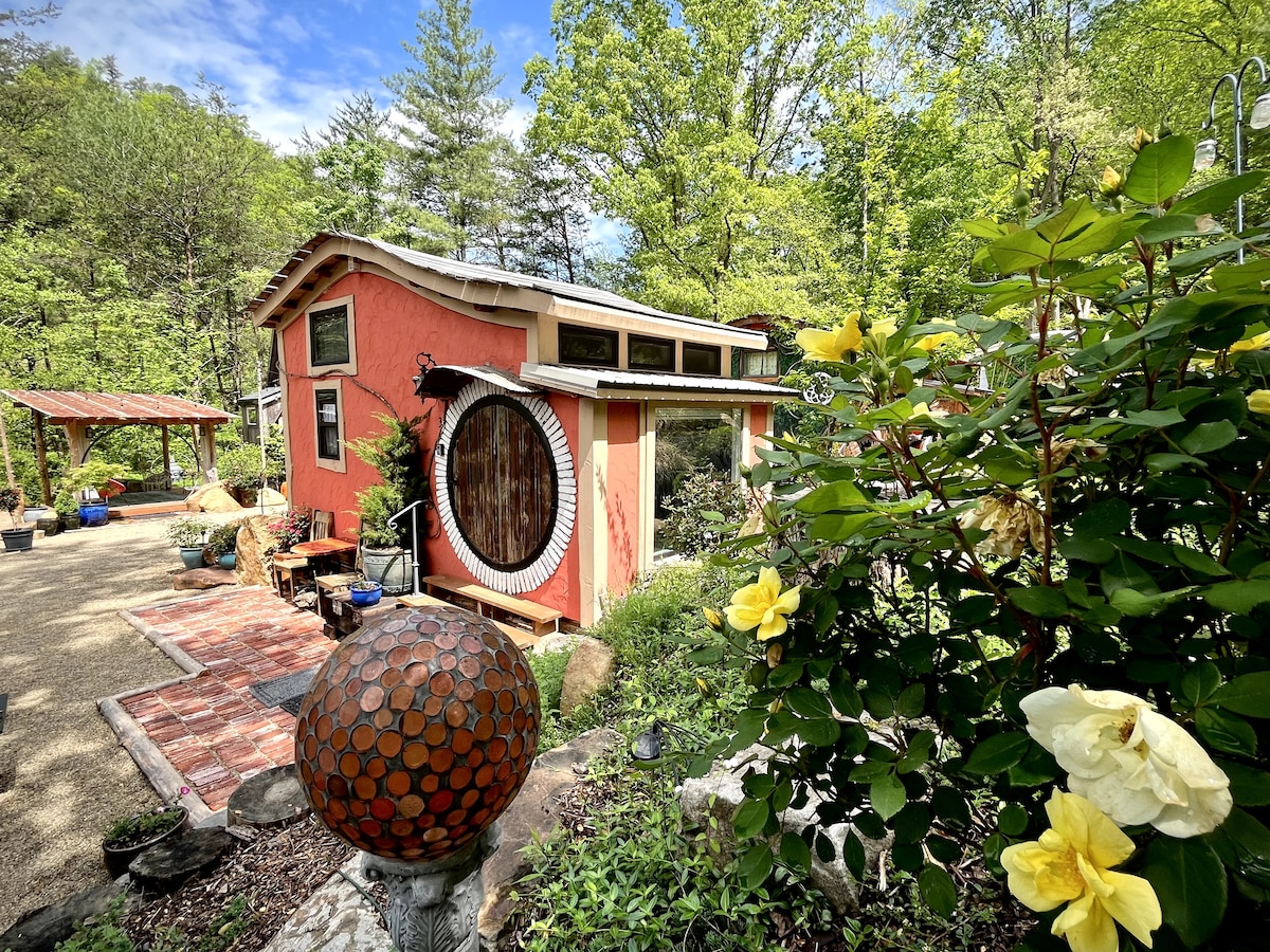 The Hobbit-inspired house is surrounded by roses, beautiful landscaping and plenty of nature. Located minutes from top attractions in Pigeon Forge, Gatlinburg and the National Park. Enjoy 200+ sqft of living space including WiFi, loft with queen-sized bed, living room with sofa-bed and RokuTV, kitchenette and bathroom with shower. Outdoor amenities include chiminea, lounge chairs, BBQ area, picnic tables, decks, and beautiful gardens. Check out our IG (@mountainshire).